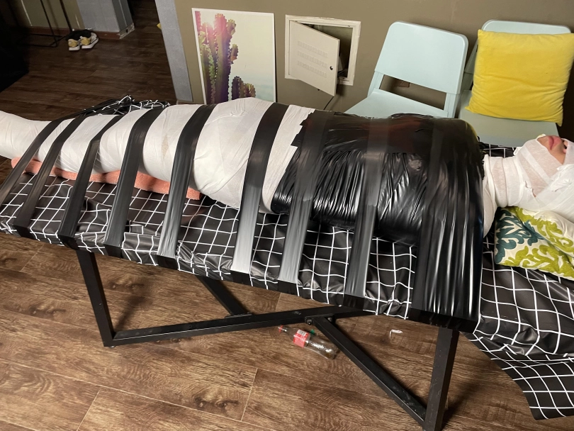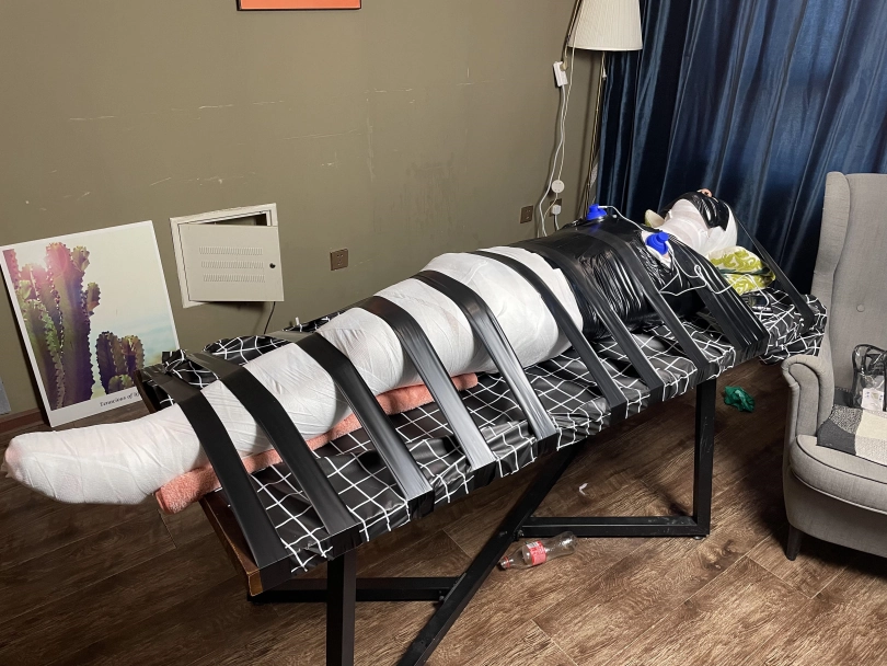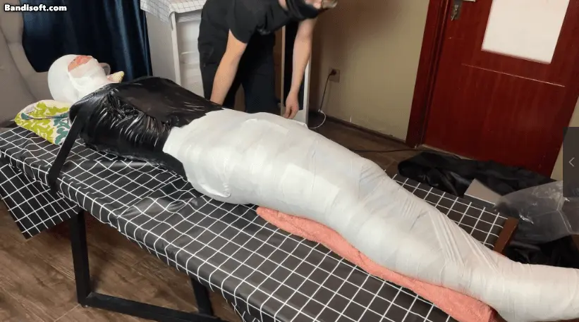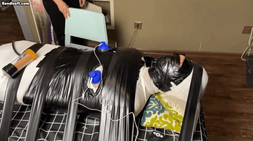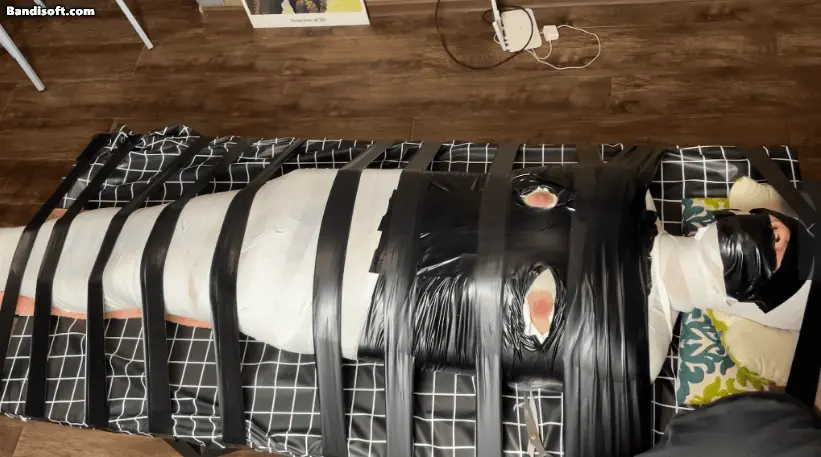 小m经历了 丝袜三重包裹 在被扔进棉被木乃伊中拘束 然后在放入真空袋中强力拘束刺激。