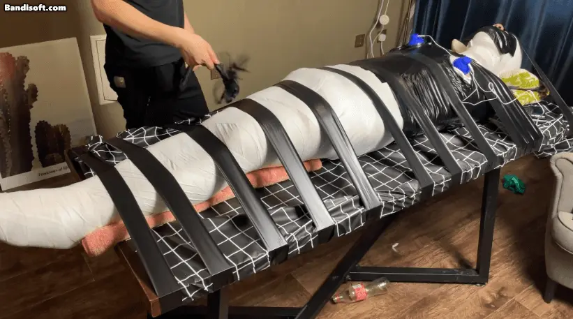 然后放出来后又被绷带缠绕 胶带强制固定 电击安装在RT上 榨汁机疯狂榨取。