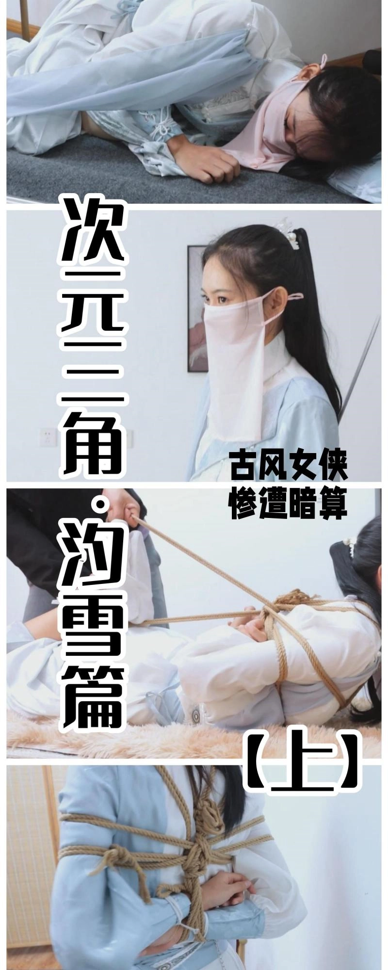 因为这部由语汐主演的女侠就叫萧汐雪,所以标题里的汐雪篇不难理解,但这个跟次元三角有什么关系呢?我来解答一下,这是我接下来筹备要拍的三部曲,将会选用三个模特的单元剧(或者两名模特的单元剧)最终由三名模特以时空穿越的形式齐聚在一个三人本来收尾,次元三角这个名字取自我玩过的一个剧本杀(讲的是不同时空的同一个体穿越到一个时空的故事)所以首当其冲的汐雪篇就应运而生了,这是个完整的故事,而且本着尝试的心态,这次没有选择白棉袜,而是选择了跟古装配套的白布袜,应该很少有这样的作品,这也算是补足了童年时对那些古装女侠紧缚的幻想吧(还有那个启蒙足控的倚天屠龙记,对,说的就是你,赵敏)
