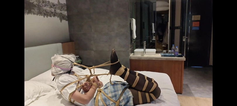 超级硬核极限驷马强制抬头。由于太紧了期间居然出现短暂晕厥吓得我赶紧解开头上的束缚。突然发现小m包里有一根皮鞭那就赶紧试试吧。