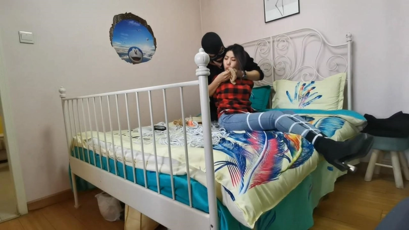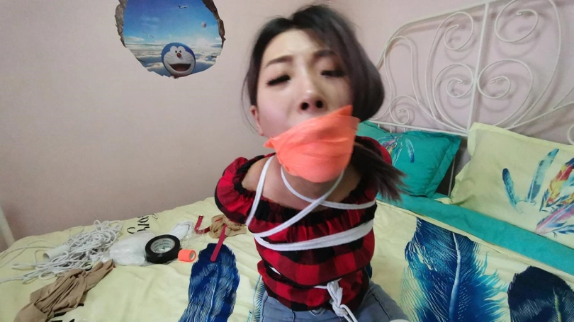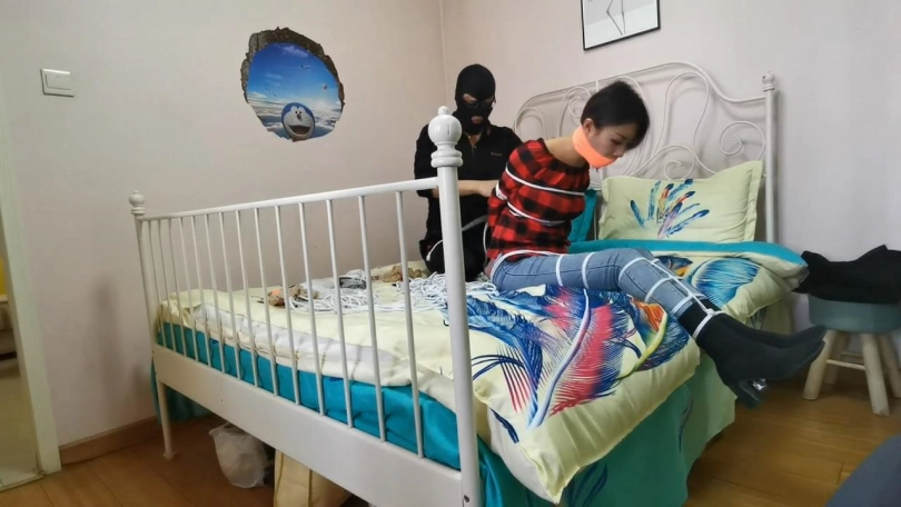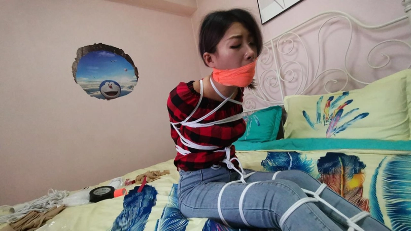 美女回家后无聊,自己玩捆绑,刚绑完腿脚,谁知进来了劫匪,把她一顿虐捆绑,并用震震让其GC,其他不多说,自想。