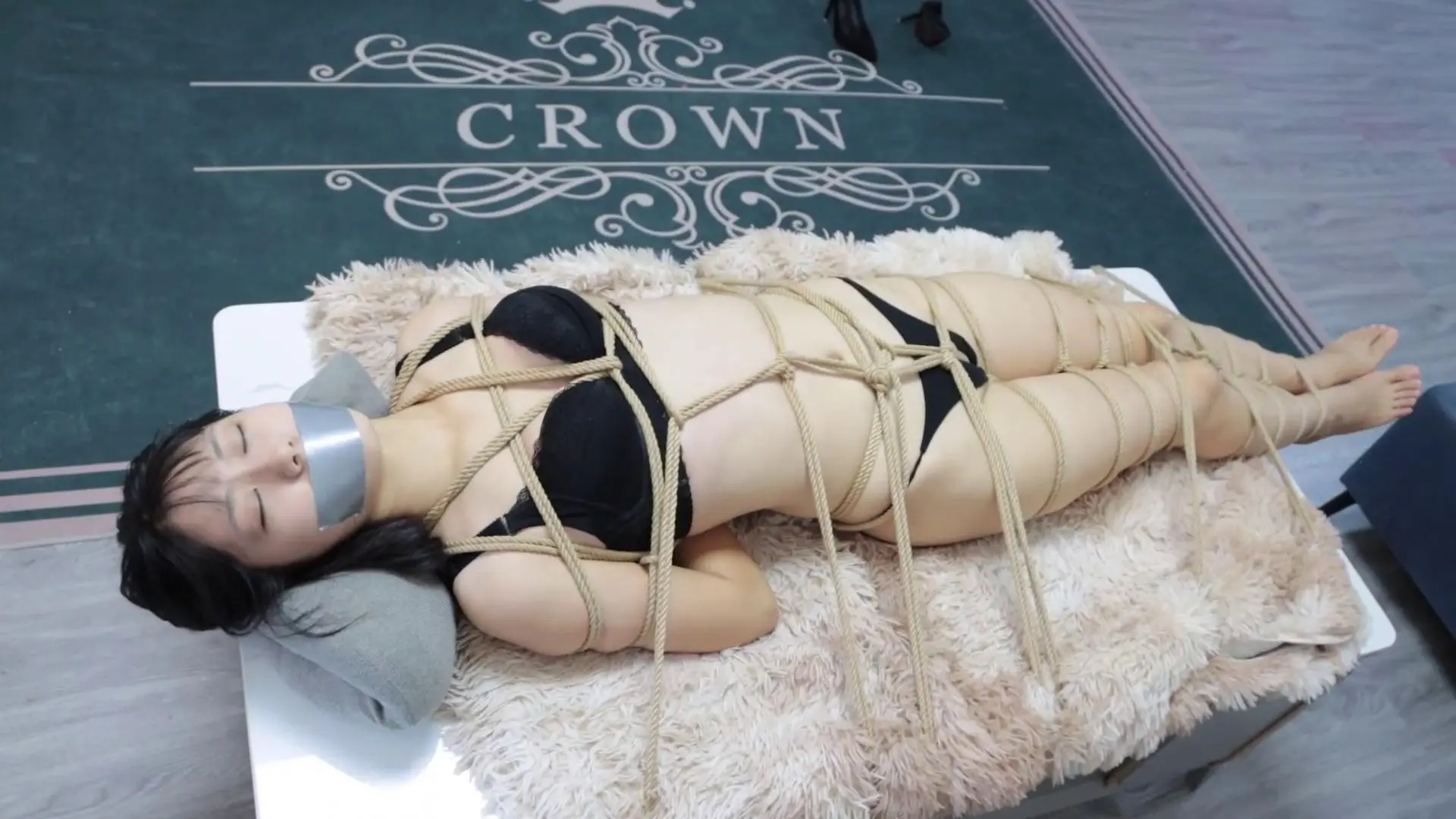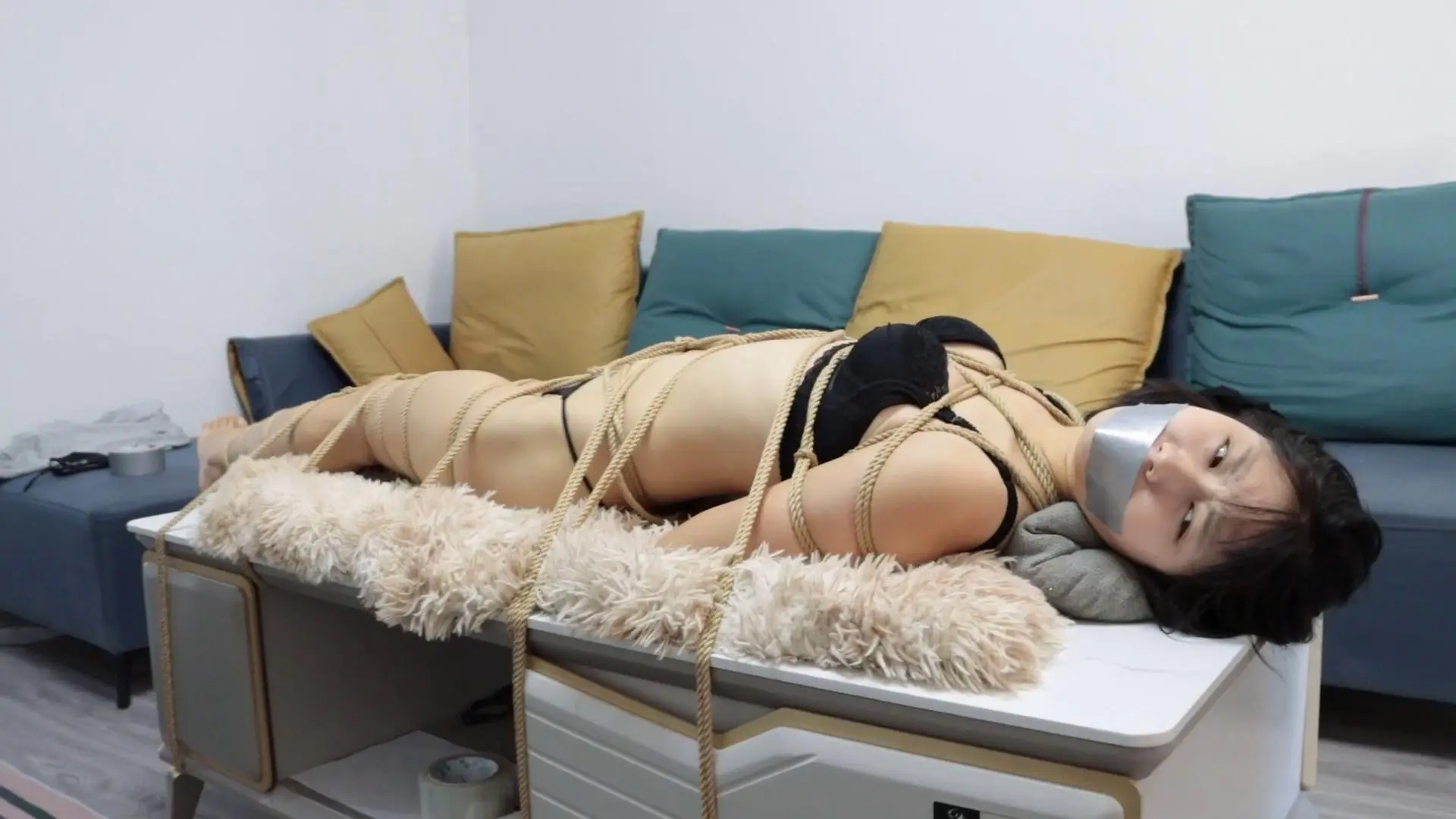小七在玩女人方面从来不缺乏创意,可怜的清岚被小七捆成了人体家具,平时不但能置物,还能产生口水灭烟头,最最重要的是还能上下其手,挠挠脚心,摸摸屁股,小七玩的心满意足。玩够了就把清岚绑成人棍固定在茶几上,就这样清岚被小七玩了好几天,最终也逃跑不了被装箱运走的命运。