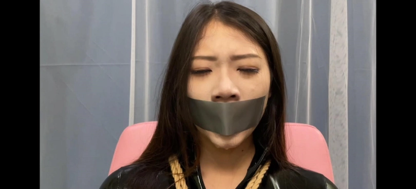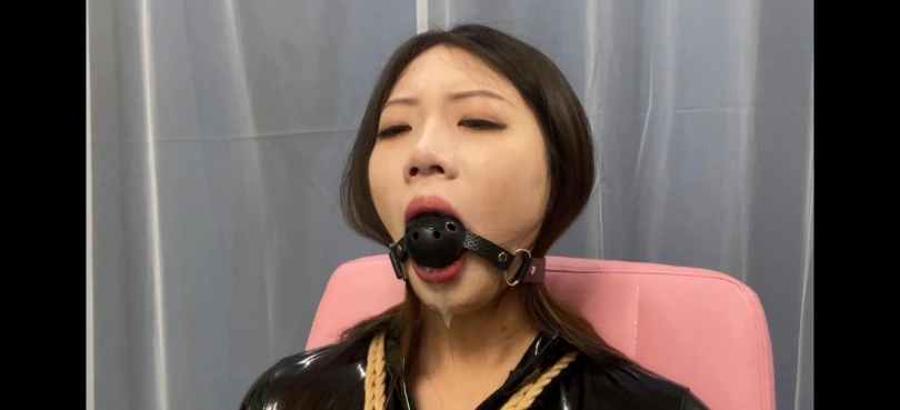 梓潼身穿性感连体皮衣和恨天高防水台高跟鞋,捆绑后金属口球堵嘴口水流不停,还有透明胶带和银色胶带封嘴,口水不停滴落,最后黑色口球堵嘴,呻吟很诱人,模特也很努力,梓潼的身材也很不错
