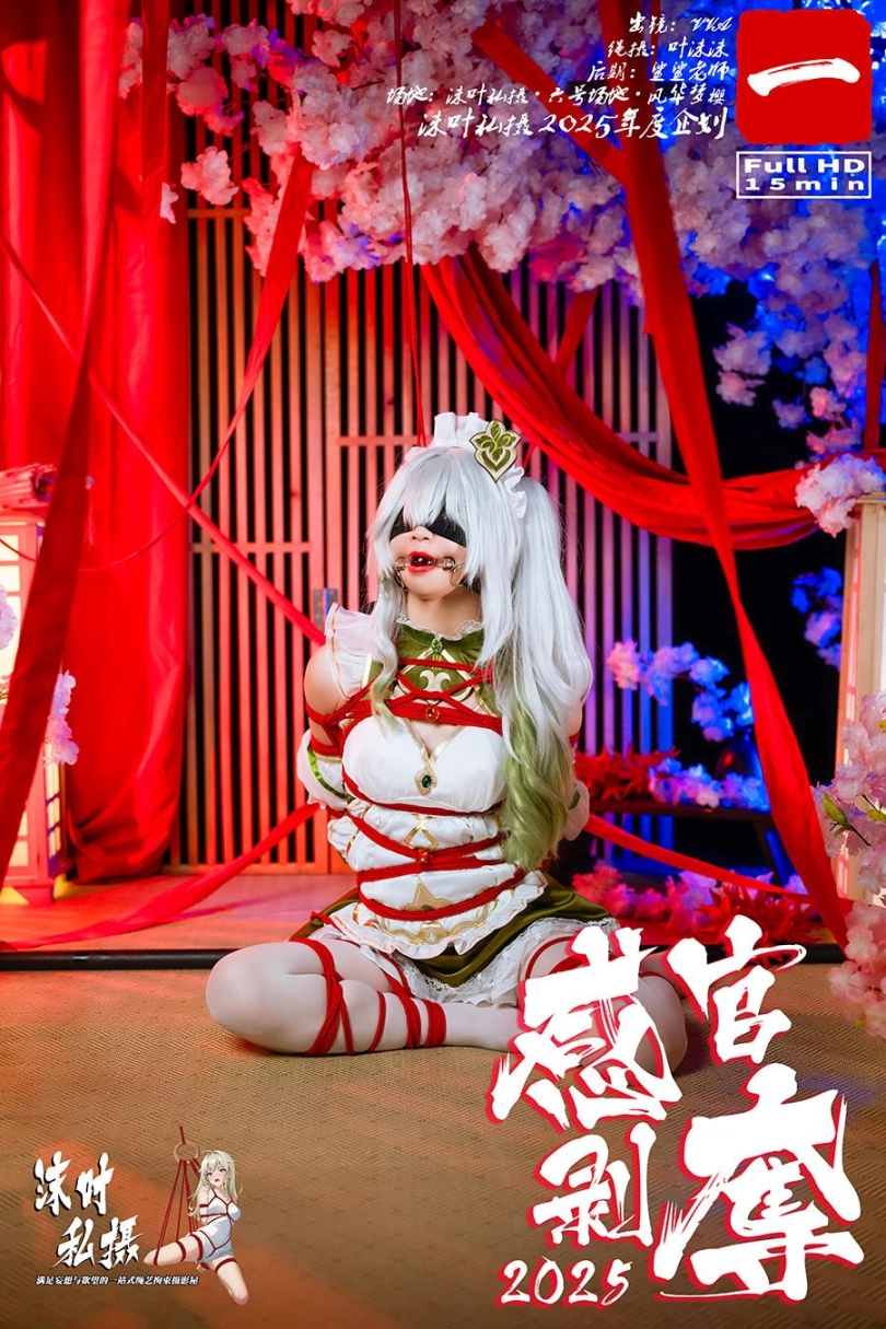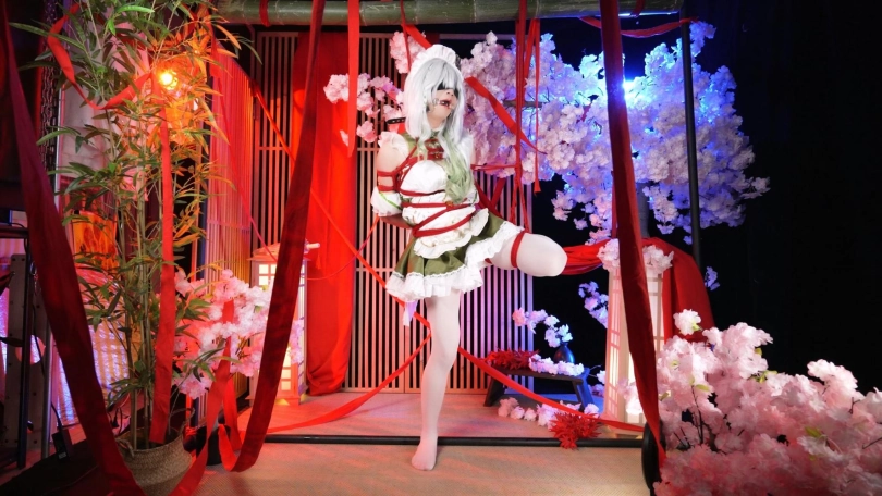 蒙眼、封耳、堵嘴,纳西妲女仆的捆绑放置挣扎,日式折腿缚+日式片足吊缚