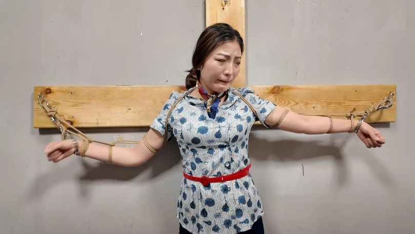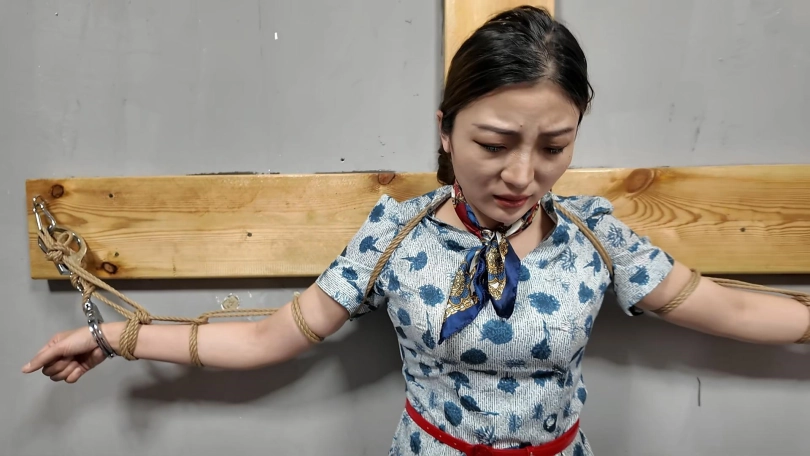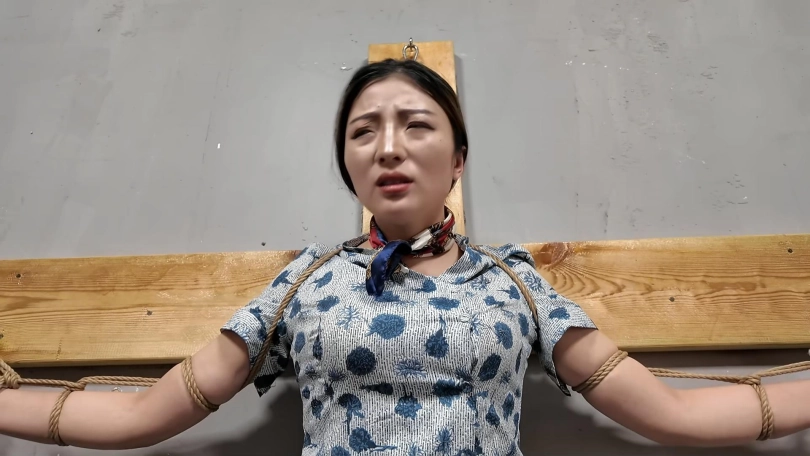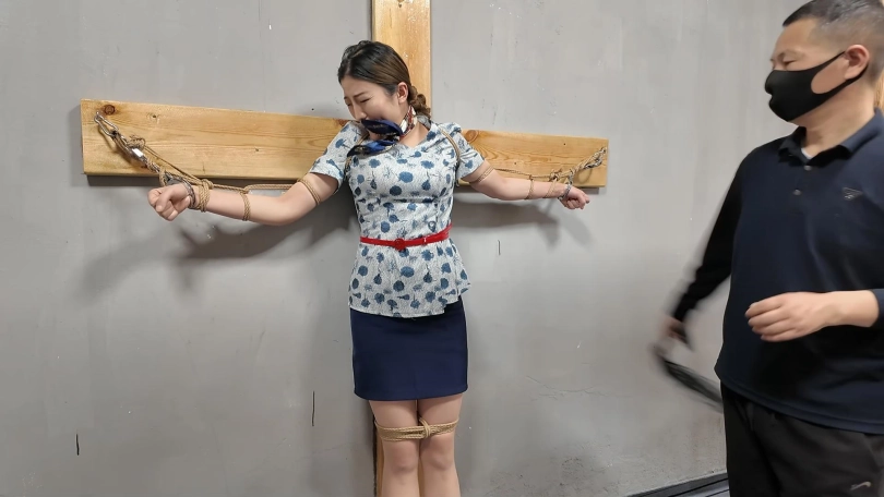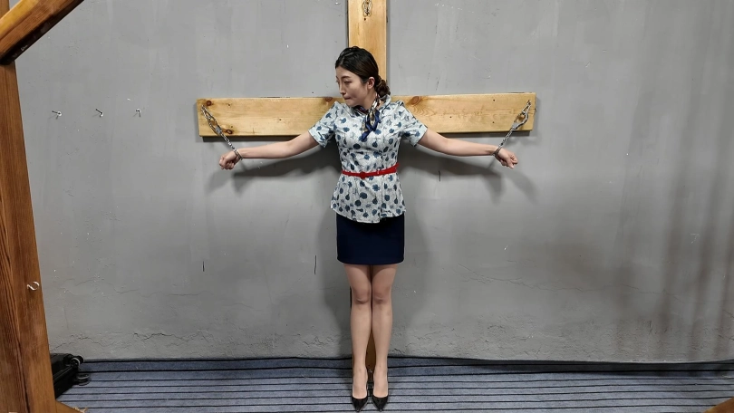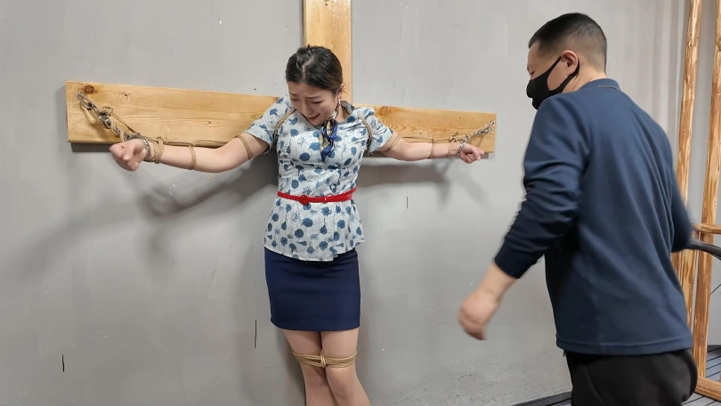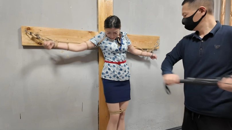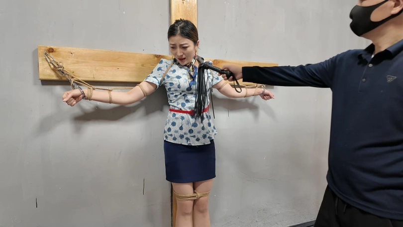 佳佳JK装十字架受刑,龙门架吊刑,被鞭打肚子,鞭打胸
