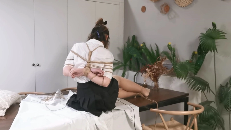还是JK制服,这次绑的是中式五花,驷马放置在桌子上,并用马具口球堵嘴,还用绳子把口球拉紧,最后玥妍的口水流的桌子上到处都是。