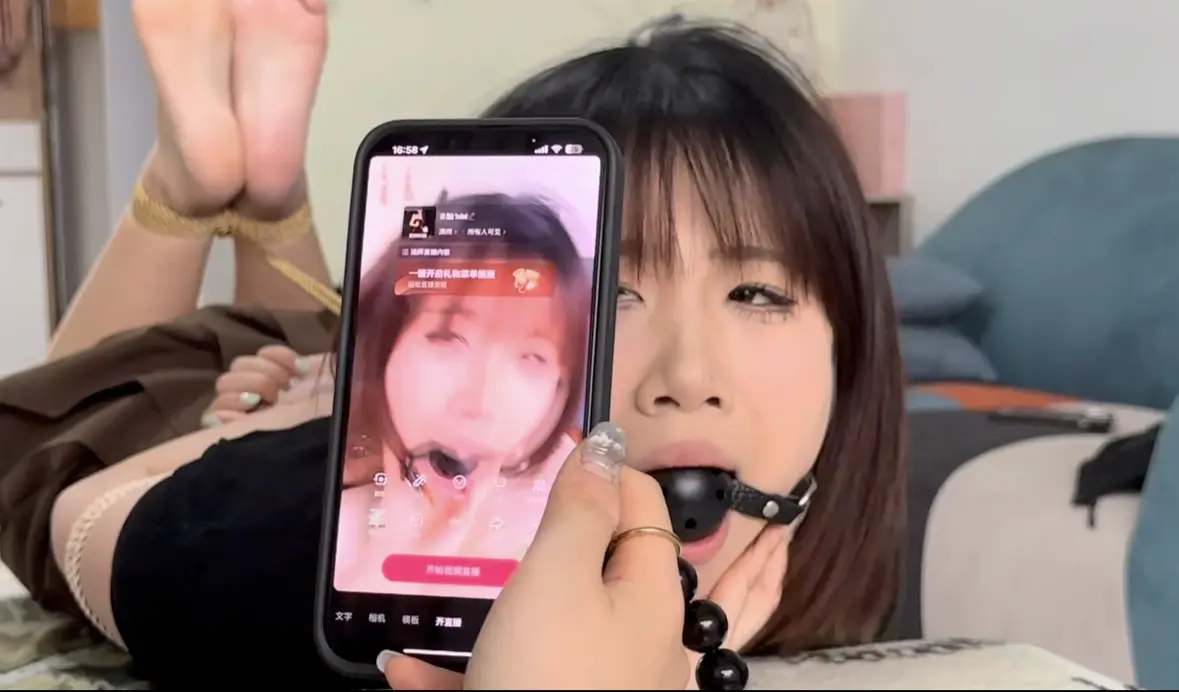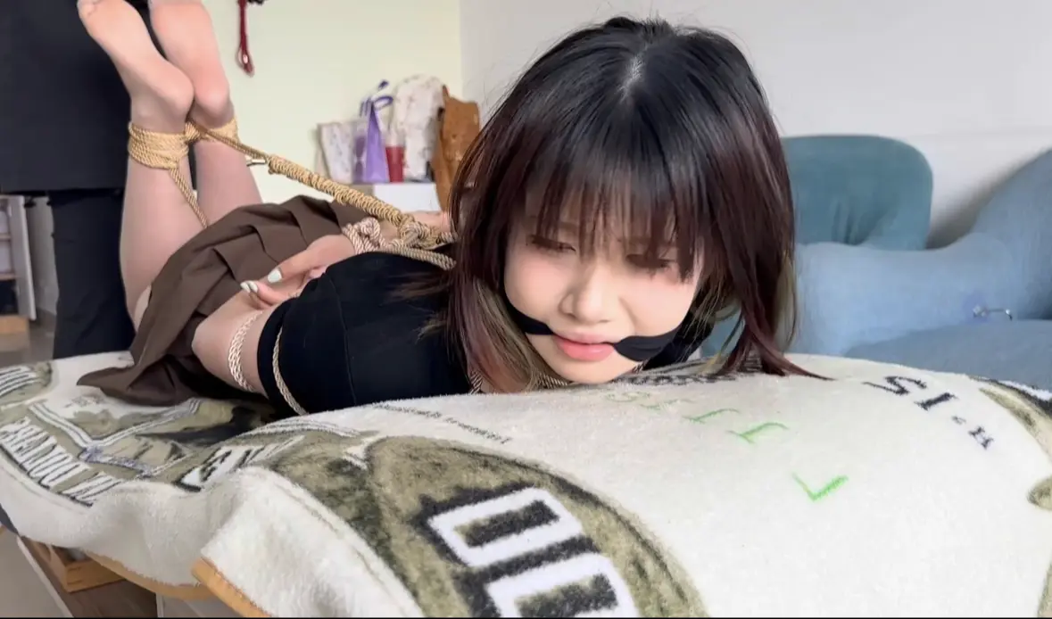 小骨下班在家玩手机被女歹徒入室捂晕,女歹徒把小骨绑在桌子上捆绑成极限驷马,过了一会...