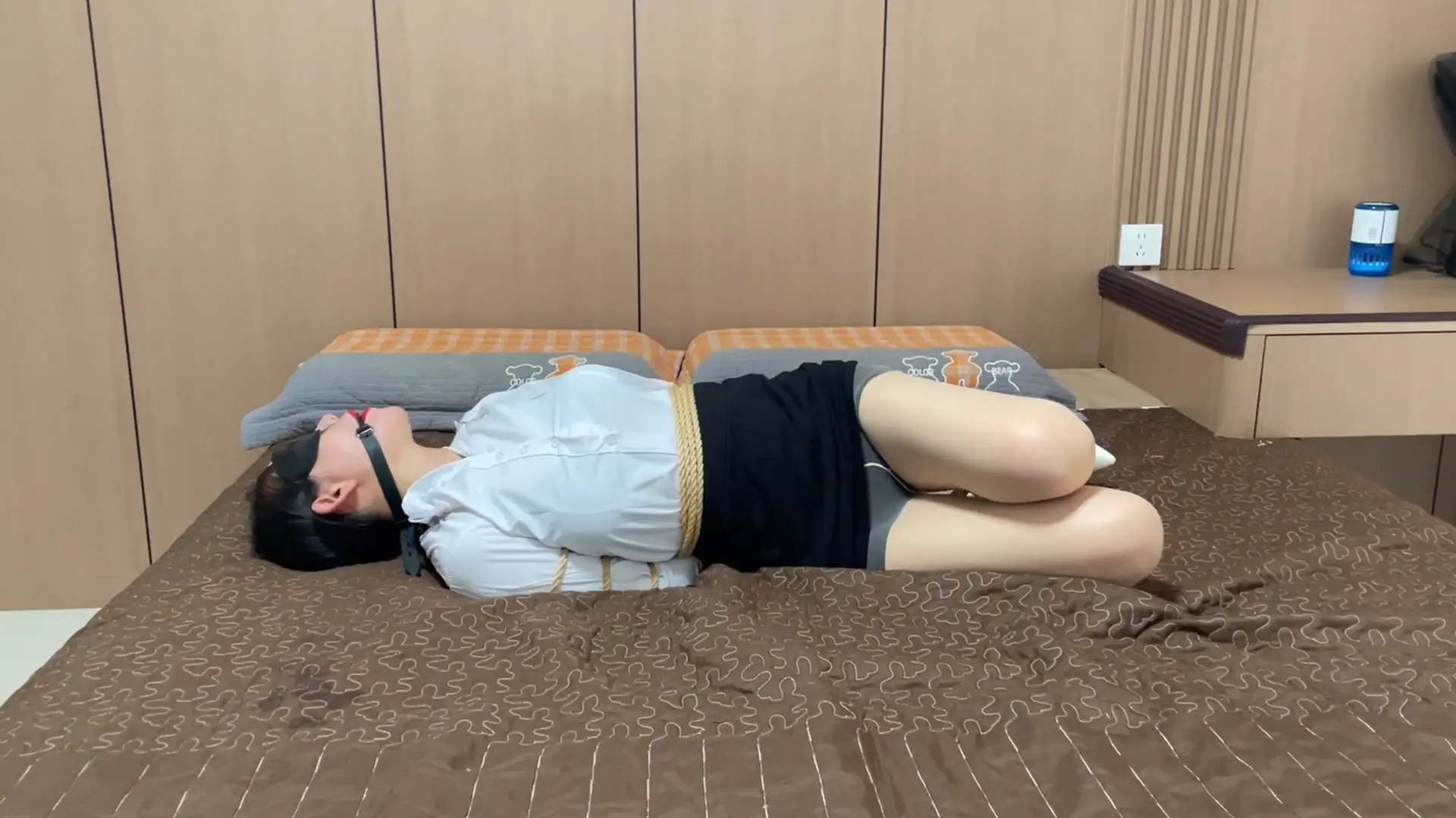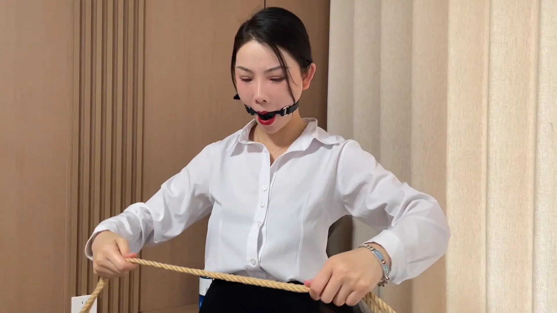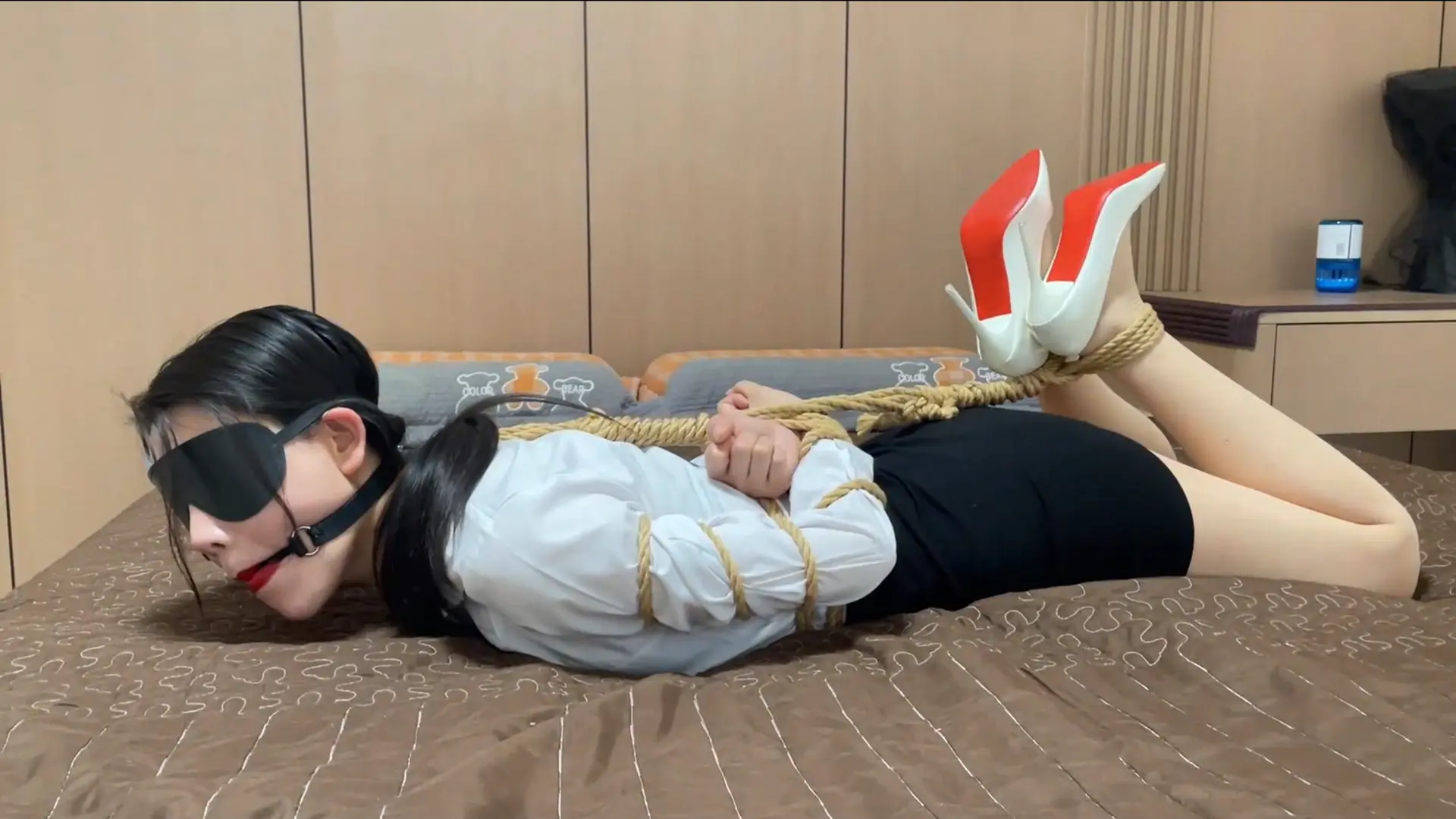 【视频时长】:00:34:25 【文件大小】:1164MB 请到的模特是柳洋和恩可(七七),这个系列视频的剧情内容为女特工在家自缚以练习脱缚术,不料却被女飞贼入室偷袭迷晕,在被女飞贼捆绑玩弄之后,女特工利用飞贼外出取钱的时间挣脱束缚,最终反杀女飞贼并狠狠报复她。具体的背景介绍和角色对话如下,喜欢捆绑的可直接跳转2:00观看。 柳洋是A国经验丰富的女特工,平日里伪装成金融公司的高管,一旦有行动,她便化身成组织顶级特工完美完成上级交给的任务。 这天柳洋从公司下班回家,由于上个周完成了护送雇主的任务,上级特意给柳洋批放了一个月的假。 “难得一个月不用出任务,这回可以好好休息了。”柳洋边按摩着脖子边说到。柳洋话刚说完,手机里就弹出上级的语音消息,由于近期特工执行任务时出现了被捆绑擒获的情况,组织决定各位特工进行脱缚术训练,以增强发生紧急情况时的逃生能力。“刚进组织时,我专门研修了绳子脱缚术,不过过了这么长时间,确实应该温习一下了。”说罢柳洋走进屋里拿出一堆绳子准备进行训练。 柳洋模拟执行任务时被擒的场景,将自己捆成驷马,嘴里堵着口球,眼睛被眼罩遮住。将自己捆绑完之后柳洋就开始在床上挣扎脱缚,挣扎了几分钟绳索并没有挣开的迹象。“好久不练真的手生了,不过这越挣脱不开越兴奋的感觉是怎么回事,难道这就是受虐M的感觉吗”柳洋心里暗自嘀咕道,随后柳洋慢慢减小挣脱的力度,整个人竟开始享受被绳子束缚的[X_X]。 恩可是一名入行多年的女飞贼,最近她潜入柳洋所住的小区准备偷盗,经过两日的踩点,恩可根据往日经验做出了判断:“(柳洋)既然是高管,肯定薪资很高,估计家里也有不少钱,而且看她每次上下班都是独自一人,即使偷盗的时候被她发现了,以自己的身手也可以制服她。” 这一天恩可终于决定下手,恩可一路摸至柳洋家门前,利用工具潜入了房间。“嗯?没人吗?刚刚亲眼看到她回家了。”没有见到柳洋,恩可也不敢贸然行动,只好悄声摸索各个房间,当恩可摸到卧室时,房间内隐约传出挣扎的娇喘声“呜呜。。。呜呜”。恩可稍稍拧开房门往里一瞥,竟看到柳洋在床上挣扎脱缚。“呵,没想到这次的目标居然是个喜欢捆绑自缚的M,真是得来全不费工夫啊”。恩可暗自高兴,随即踱步摸到床上,用手抚摸着柳洋身体,随后凑到柳洋耳边:“自缚的感觉爽吗?要不要我帮你更爽一下。”听闻此话,一直沉浸在束缚[X_X]中的柳洋猛然惊觉家里有不速之客闯入,马上呜呜地奋力挣扎。一看柳洋想挣扎,恩可立即拿出沾有迷药的手帕紧紧捂住柳洋的口鼻,柳洋摇头挣扎,可药效太猛,不过十几秒柳洋就被迷晕了过去。“喔,这新款迷药真是厉害,没想到几下就给这小妮子迷晕了。”恩可看着手帕不禁感叹道,随后便一脸坏笑地看着柳洋,“难得遇到一个这么喜欢捆绑的小妮子,那就让我给你设计个新造型吧”。 恩可把柳洋迷晕后褪去她身上的OL套装,改换成黑色的连体丝袜,白色高跟鞋也换成黑色凉高跟,随后将柳洋后高手折腿缚捆绑放置在床上。趁着柳洋还在昏迷,恩可在房间内一顿搜刮,搜出了几张银行卡,“看来这小妮子没什么现金,都把钱存在银行里了。” 这时柳洋逐渐从昏迷中苏醒了过来,“太大意了,居然被人偷袭迷晕了,这女人是谁,难道是敌对组织的特工吗”柳洋心里思考着这个皮衣女人的身份。 看到柳洋醒了,恩可来到床边:哎呀,小妮子,你总算是醒了,你那套职场套装不够性感,我给你换了一身更性感更适合你的衣服和束缚造型,怎么样满意吧。被偷袭的柳洋看到自己被绑成这样,一时间羞愤难当,睁大了眼睛怒视恩可。 “还敢瞪我,看来你是不服气啊,正好我在你家里找到两条穿过还没洗的丝袜,正好能派上用场”。说罢恩可拿起一条丝袜蒙住柳洋的眼睛,蒙完眼睛后开始对着柳洋上下其手,用手玩弄柳洋的腰部和玉足还不够,恩可居然一手不断揩油,另一只手拿起刺轮在柳洋身上持续游走。 “你这小妮子长得不错,身材也好,这小细腰比我还细,还有这小脚,我要是个男人怕是都把持不住了”恩可一脸坏笑的说到。被揩油的柳洋左滚右翻想要逃离恩可的控制,但被恩可轻易擒回,恩可的不断调戏让柳洋痛痒难忍,想要抗议但嘴巴被口球塞住,千言万语也只能化作呜呜声。恩可此时停下了调戏,捏着柳洋的嘴巴问道:“小妮子这下服了吧,不服的话姐姐还有招对付你”柳洋此刻被折磨到几乎精疲力尽,无奈的点了点头。“服了就好,我现在把口球拿下来,你要敢喊的话我就[X_X]你” 拿下口球后柳洋大口喘了几口气,问道:“你到底是什么人,潜入我家想做什么” “自然是求财啊,我踩了两天点,像你这样的公司高管,想必家里有不少钱吧。” “看来只是个普通的小偷。”柳洋心中暗自庆幸,随即便佯装弱势地说到:“好姐姐,你想要多少钱都给你,事后我绝不报警,只求你别伤害我。” “呵呵,早这个态度多好,还浪费我时间收拾你,把你这几张银行卡密码告诉我,取完钱我就放了你。” “这几张卡密码都是230158,卡里一共有五十万,全都给你。” “算你识相,不过我还得把你的嘴堵住,看你戴了这么久的口球,嘴巴都酸了吧,姐姐怜惜你这种美人,这次就用丝袜嘟嘴吧。不过呢,是用你穿过没洗的丝袜,正好让你品鉴一下自己身体的味道。”恩可一脸坏笑。说罢,恩可捏住柳洋的嘴巴,强行把丝袜塞了进去,最后用胶带