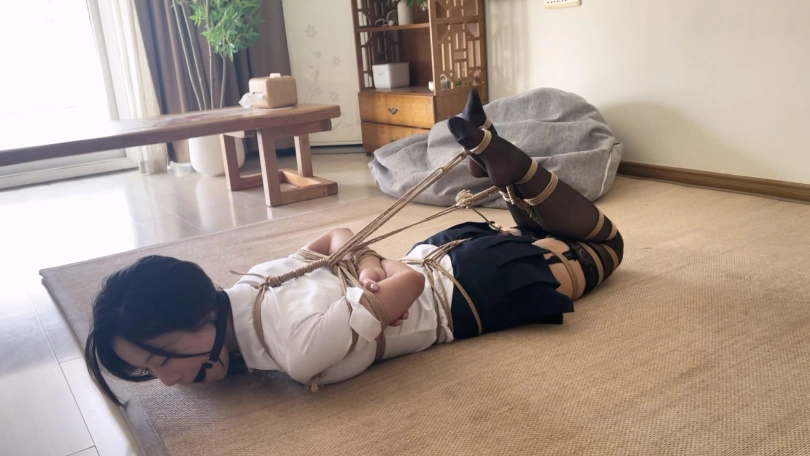肉肉的圆脸妹子小芜,短裙吊带黑丝,日式后手+并腿驷马+口球