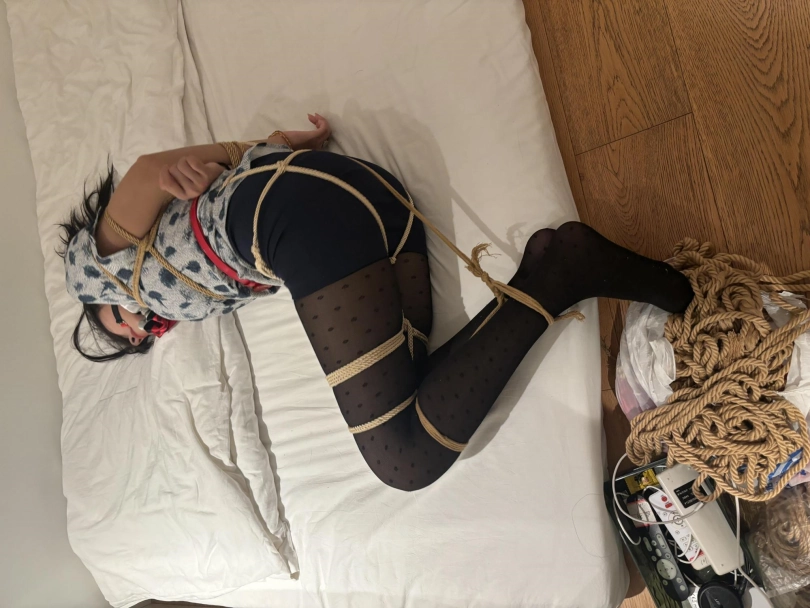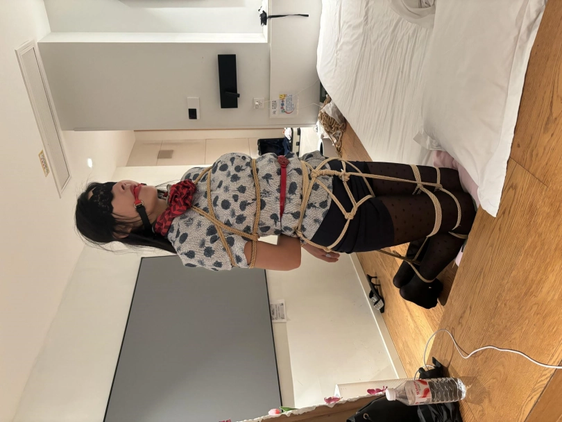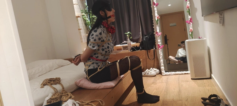 舒宁身穿空姐服再次约绳艺体验, 波点黑丝+高跟+口球堵嘴/胶带封嘴+蒙眼+驷马+tk+挣扎,先是并腿缚后蹦跳后,然后跪着挪动,最后驷马,挣扎给力。
