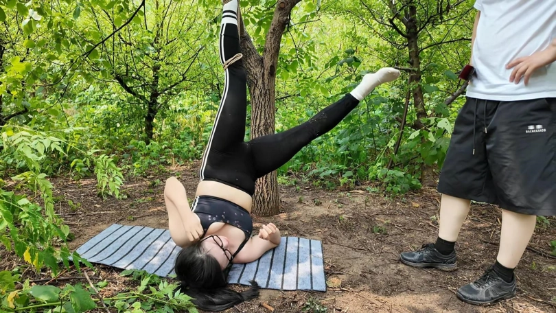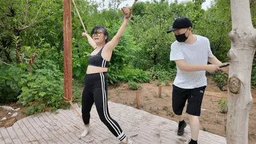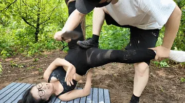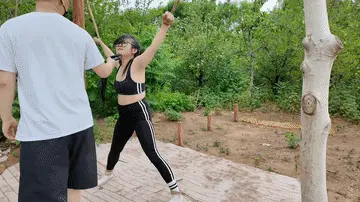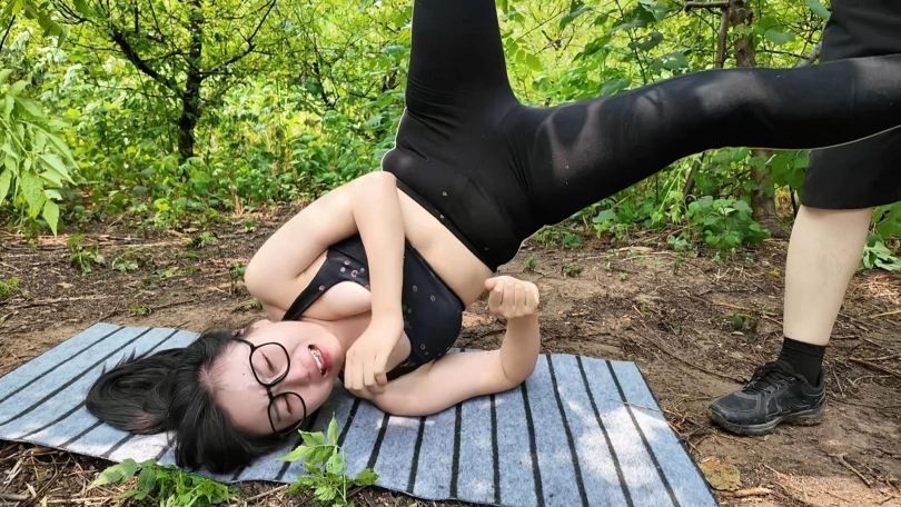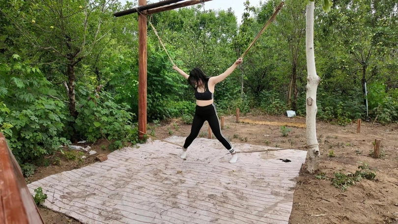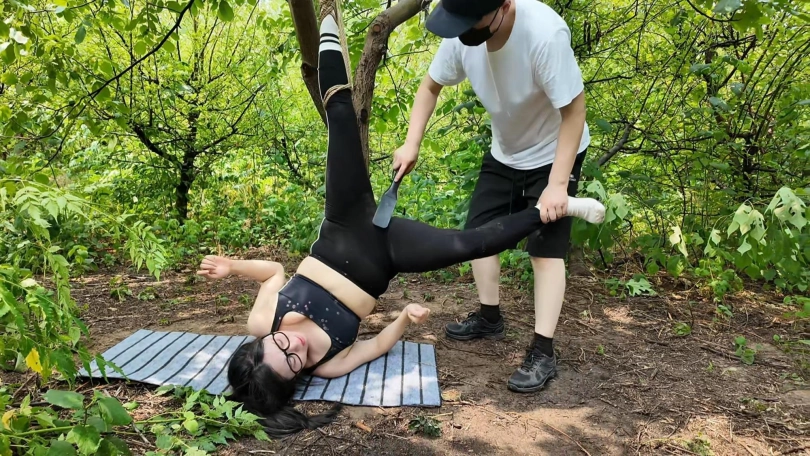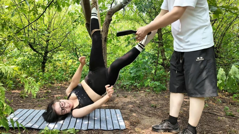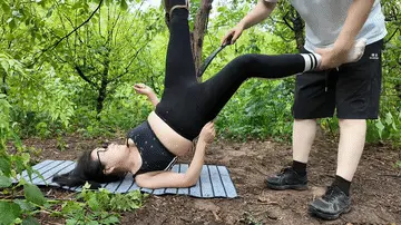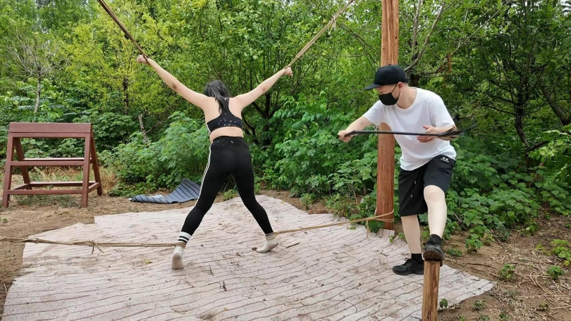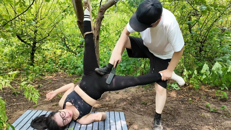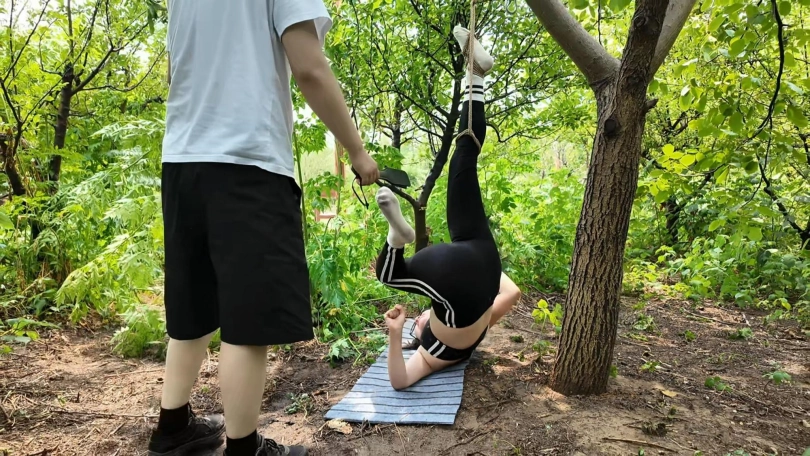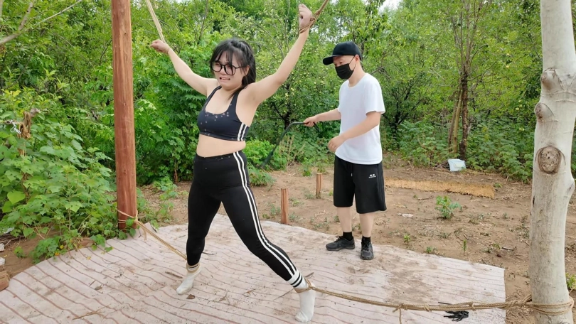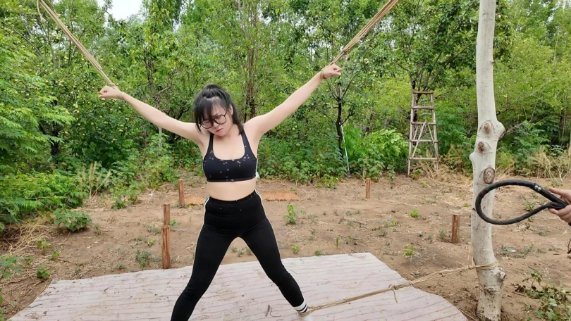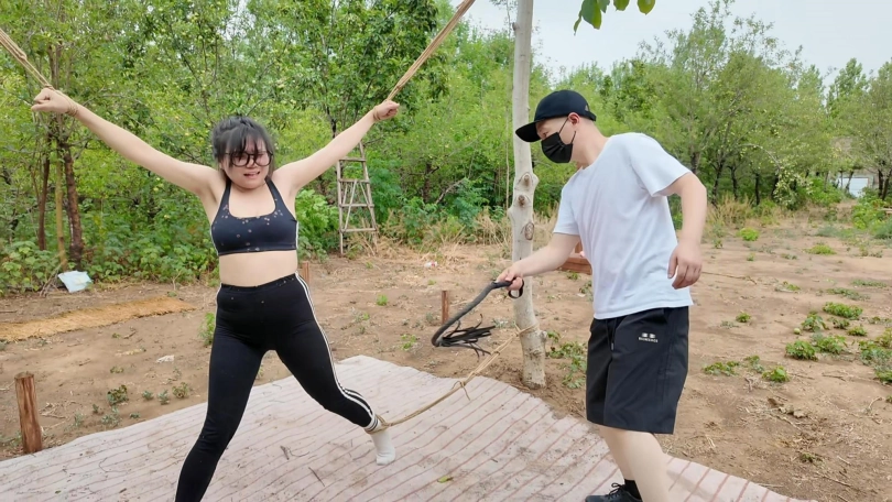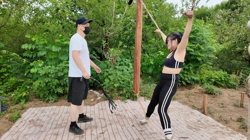 惩罚小遥继续升级,木马上拉下来,带到小树林,单腿吊到树上继续鞭打,踩踏,并用棒墙高,接着大字捆绑到架子上继续鞭打,打完留她一个人在荒郊野外放置