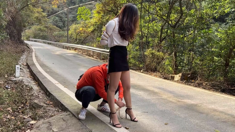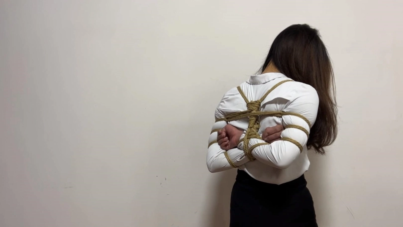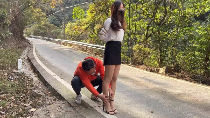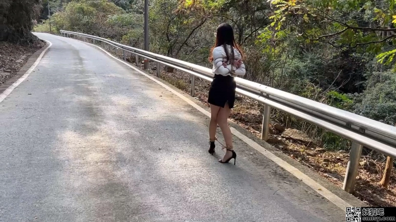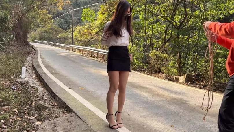 先秦淑女步步步有态度,在生活中当白领的洋洋,终归要经常训练一下仪态,以免影响形象,主要的训练方法就是穿上一步裙OL装肉色丝袜,脚踩10cm细高跟一字带凉鞋,既能展示形体,丝袜搭配一字带10cm细跟凉鞋,一来高跟会使人更挺拔,二来穿上丝袜脚在凉鞋里很容易打滑向前冲,很狼狈,所以非常训练核心力量,搭配上紧缚五花大绑,整个人非常挺拔,在外面练习行走、蹲姿、走直线等动作再好不过,不过训练时发现穿了一步裙的洋洋走路还是过于豪迈不够淑女,猫哥又加大训练强度,用绳子将洋洋双脚束缚至与肩同宽,这样走起路来亭亭玉立,十分优雅
