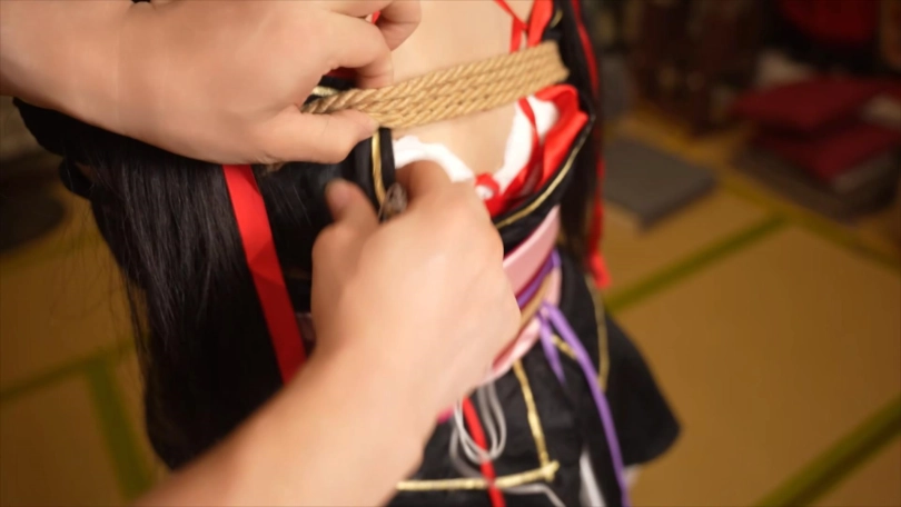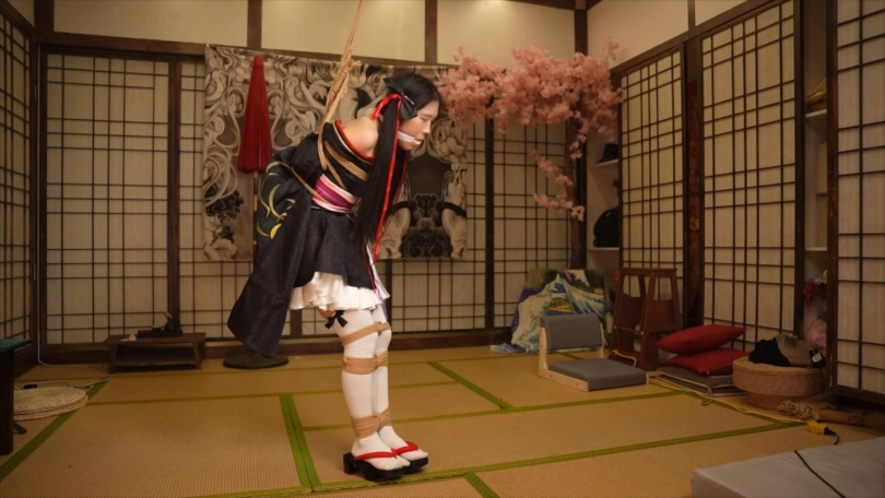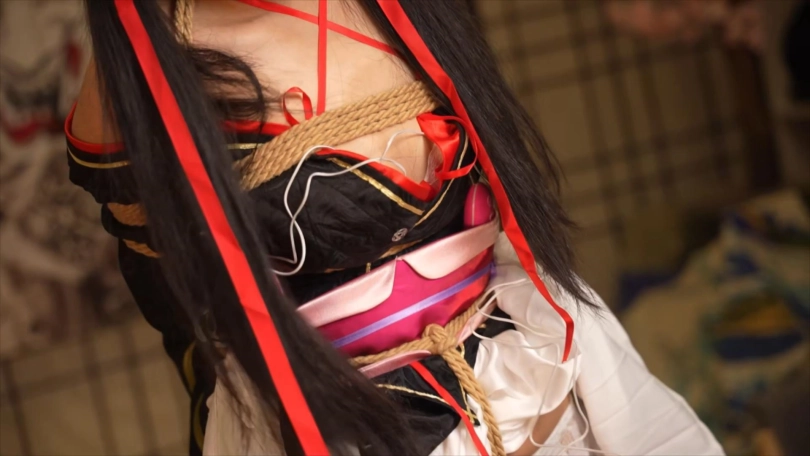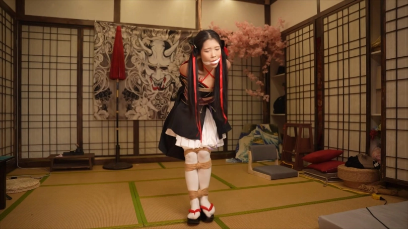 下半段的内容是踮脚吊缚,这是我最喜欢的姿势之一,能让模特被绑起来后处在微妙的平衡与不平衡的动态循环中,模特要始终集中注意力,稍微不留神就会保持不了平衡身体往一边倒,有因为身后的绳子拉住倒不下去,观赏性极佳。后半程专门安排人给娃娃扒开衣服撩起裙子,往两胸各塞了颗蛋,下面也绑上股绳和塞了颗动力强劲的蛋进去,给娃娃爽得不要不要的gc了。