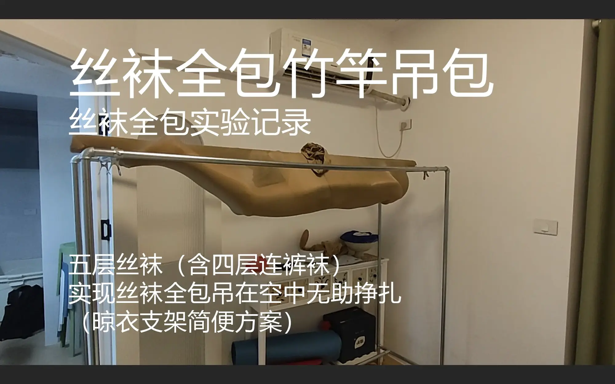 经过长期论证和前期实验后的成果,利用最新的超大码连裤袜,四层连裤袜(外加打底一层丝袜睡袋,腰部支撑用双开口睡袋不计入内)成功实现竹竿吊包,用连裤袜将肉货同竹竿绑定,并实现无捆绑、缠绕结构的纯丝袜自然悬吊全包,舒适性完爆横向两点悬吊方案。且腰部有支撑,填充物可以坚持较长时间(视频内共坚持两小时),本视频展示了全部包裹流程(除丝袜打底外),环境音和人声未消除。主包:黄苓,副包:快乐虎鲸,模特:小夜(身高175cm,体重120斤),场务助理:情报局。