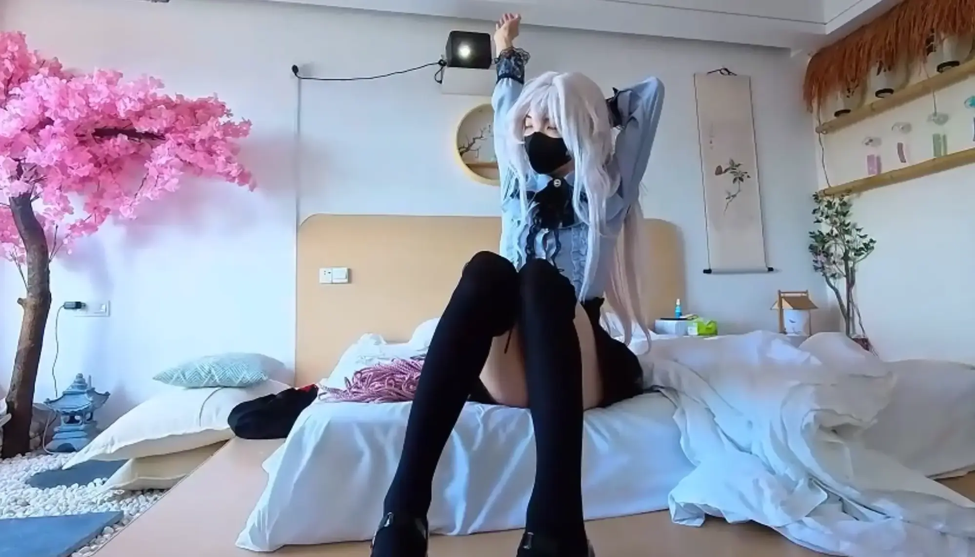 绑完后就要吊起来了,把腿抬起然后露出金棒,加上训练器,准备享受高潮吧