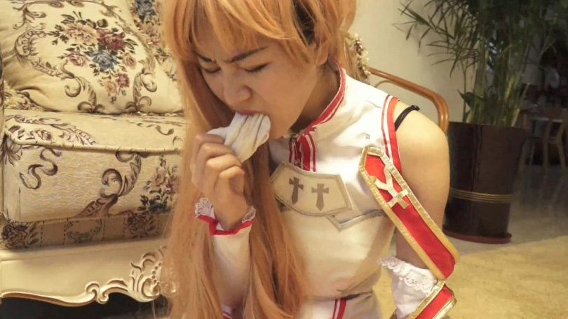 昏迷的亚丝娜被入侵者吊绑起来,不仅用绳索捆绑全身,无法动弹。更是即将要踮着脚尖承受着入侵者残忍的鞭挞……