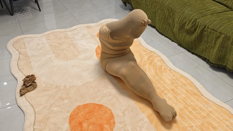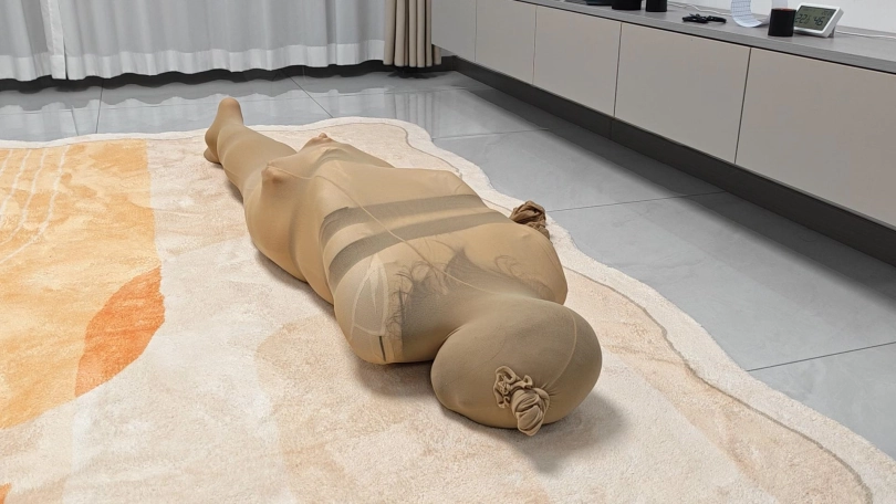 绳子捆多了审美疲劳,那就来一次胶带紧缚吧,光用胶带还不够,两层丝袜包起来,就是给模特一种逃脱无望的感觉。