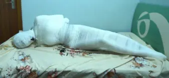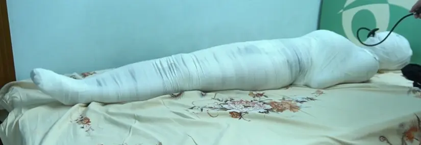 用白色绷带把可爱的jk少女一圈一圈的包紧,还狠心的塞上了巨大的充气口塞,再用绷带把口塞紧紧包裹在里面,打包好后,打开早就准备好的郊狼,看着小可爱在床上无助的扭动挣扎,像一条白色肉虫