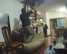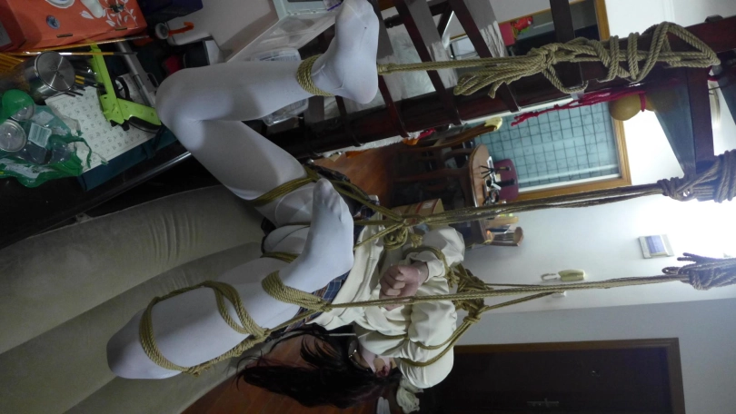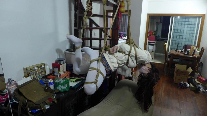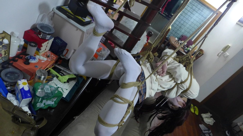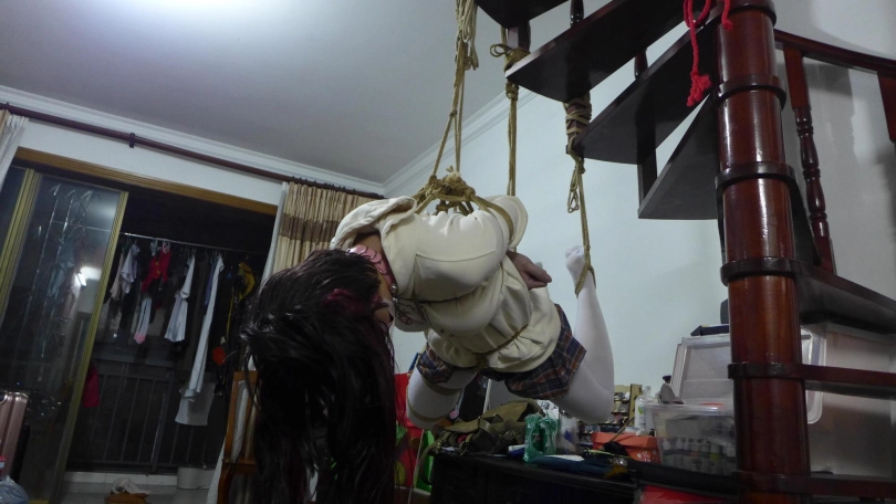 可爱卫衣超短裙少女,被绳索无情地吊在空中