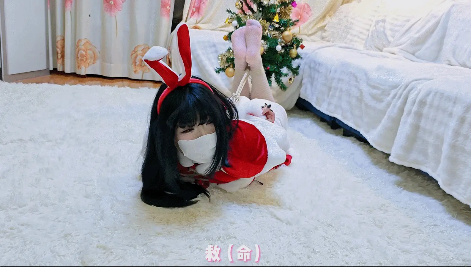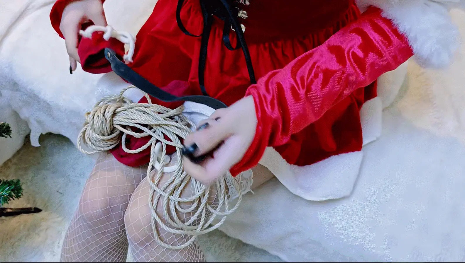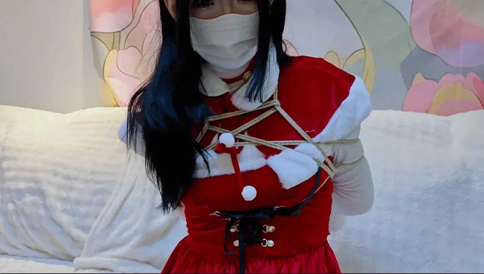 圣诞节来临,起床后发现家里多了一套圣诞的衣服和袜子,正在奇怪的时候衣服就 咻 一下穿到自己身上了,然后又在袜子里发现了一捆绳子和口球,最后就是喜闻乐见的捆绑时间啦,捆绑顺序是先被捆绑上身,站起来后又被绑了腿,尝试跳着逃跑的时候又被绑了驷马,最后在尝试呼救的时候被戴上了口球和眼罩。