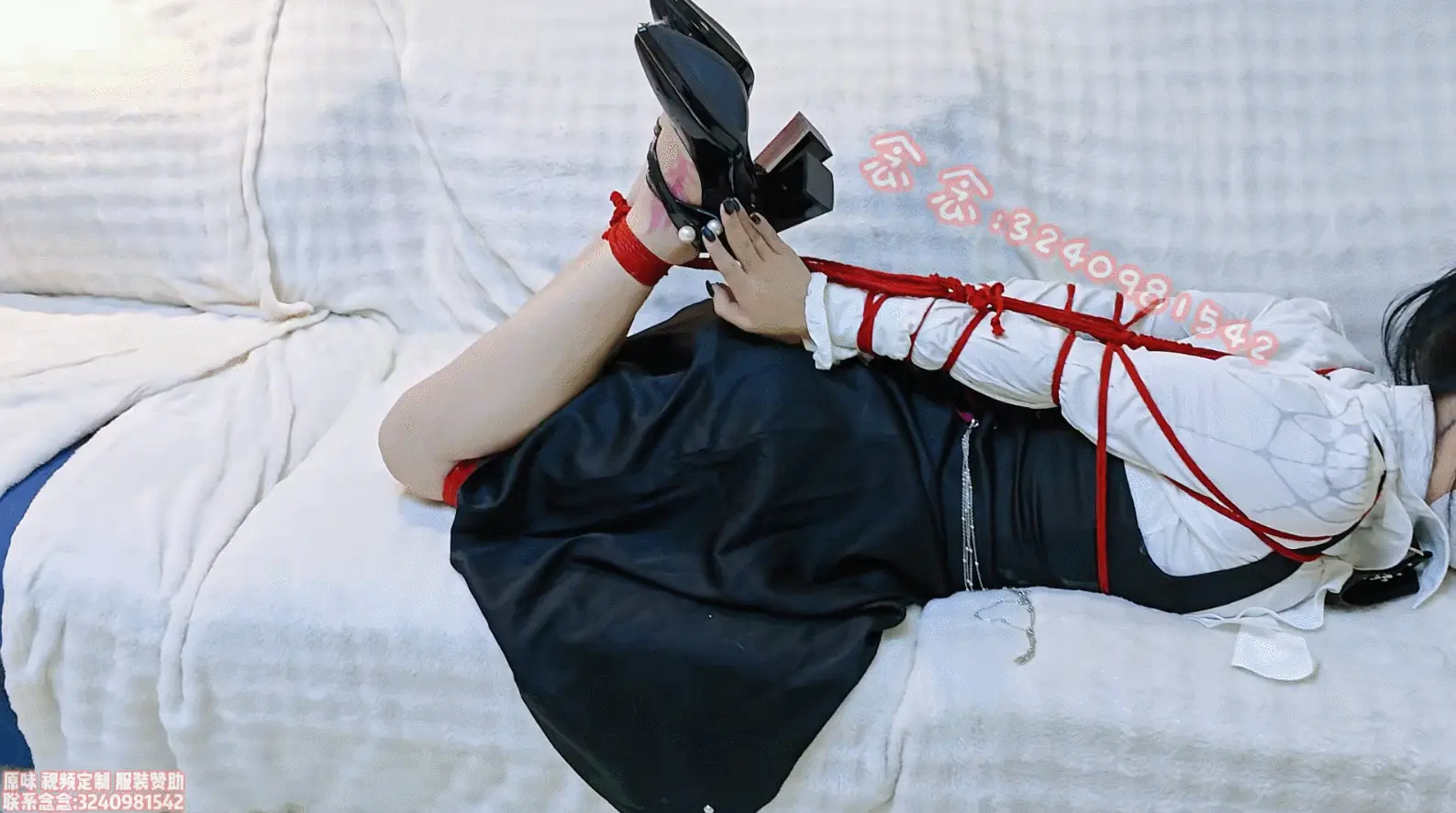 直臂是驷马捆绑,放置在沙发上,先穿着鞋子,过了一会后脱掉鞋子把脚趾也连在驷马上。//脚趾连驷马紧缚感好强,整个脚都要强行绷直,但是也真的很疼