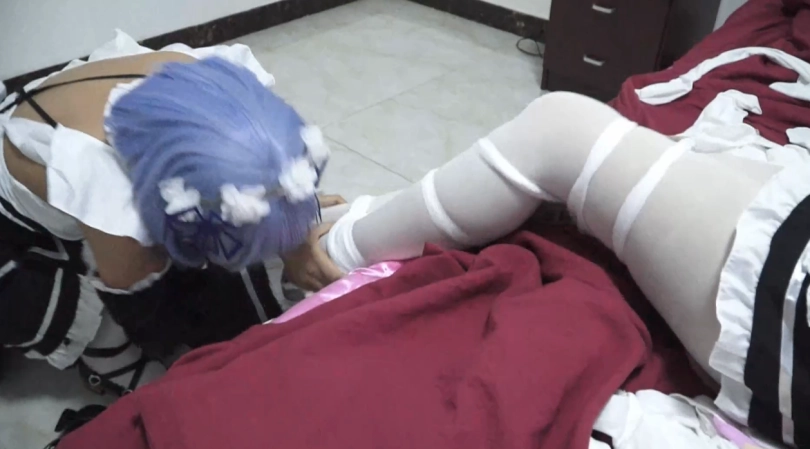 一直想有个玩伴的雷姆,用数十条丝袜铺在床上,设计绑架捂晕了来寻找一个欠钱朋友的女子,并且给她换上了拉姆的衣服,强迫她做自己的拉姆玩伴。但拉姆并不愿意屈服,雷姆便用数条丝袜将其窒息,又强吻她。看着被折磨的有点可爱的拉姆,雷姆还忍不住去亲吻她的脚丫,让拉姆处于无奈的痛苦。