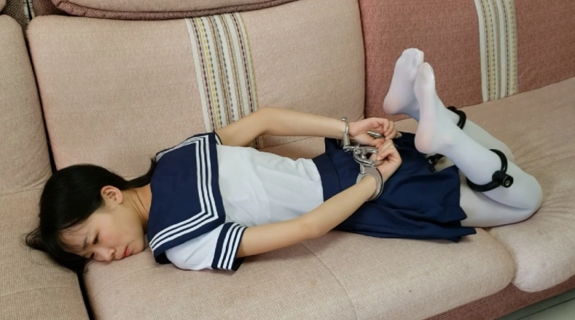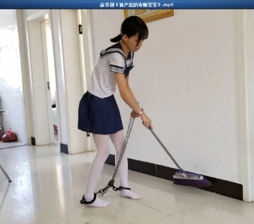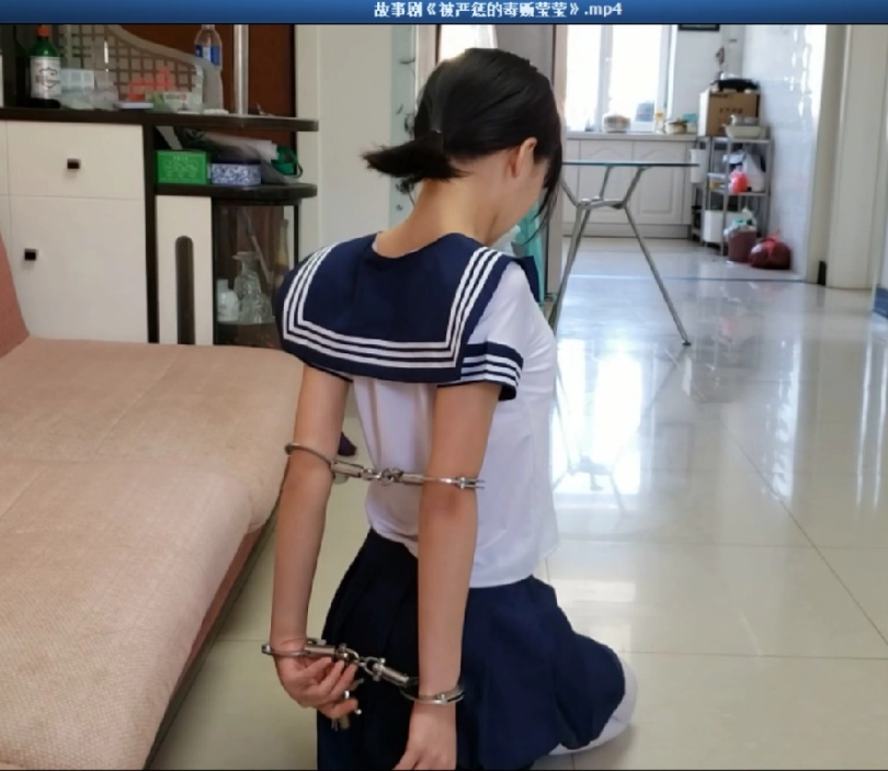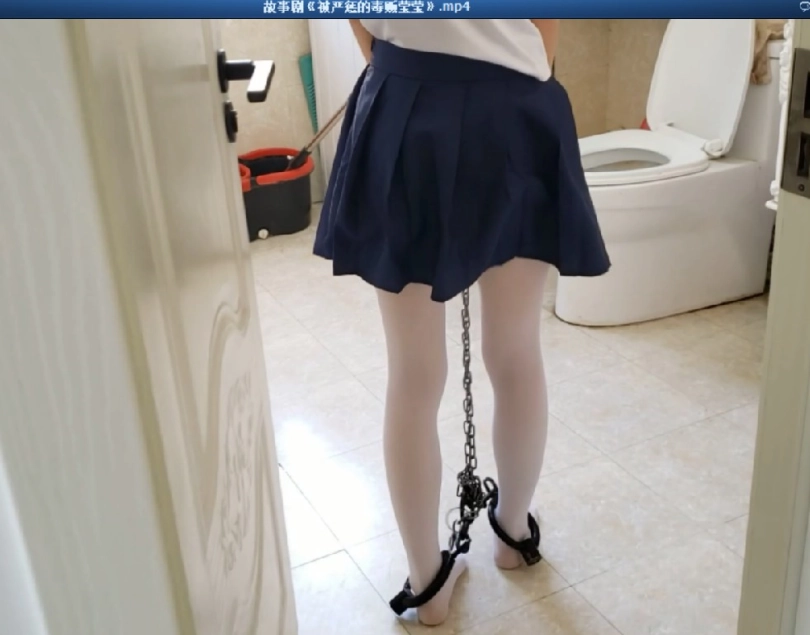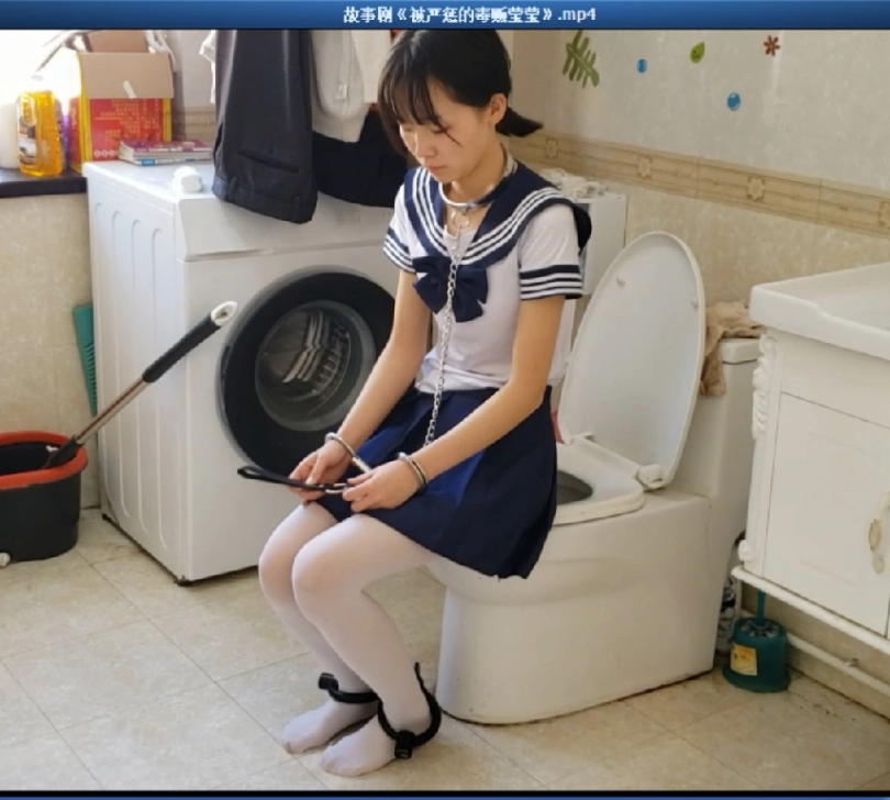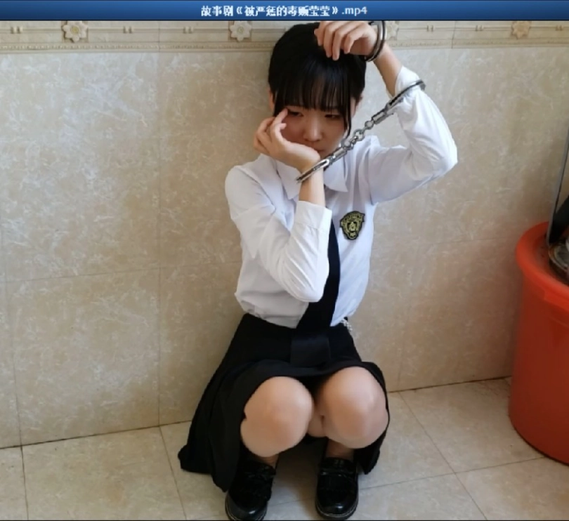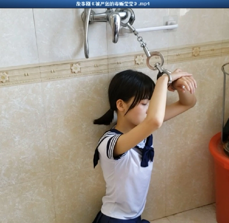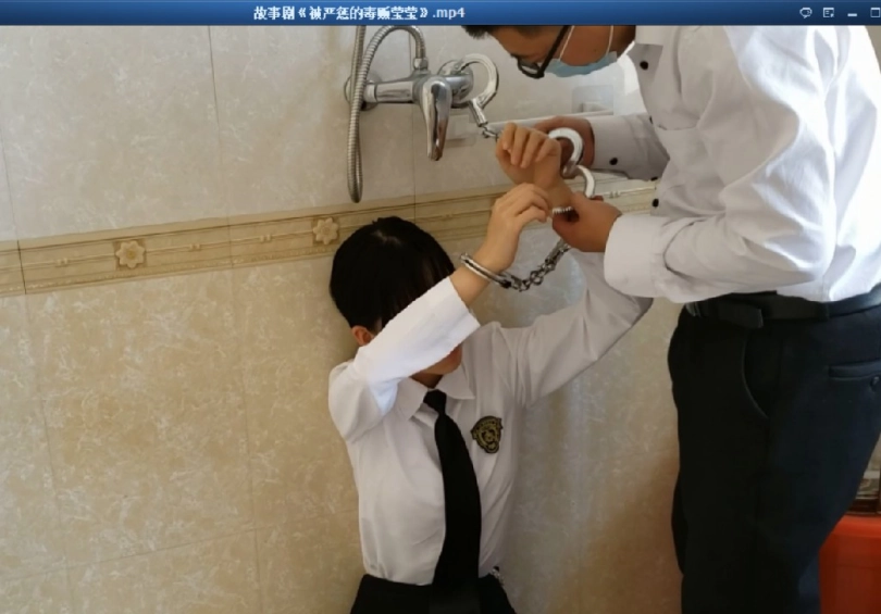 假警、警察给莹莹戴上手铐,押到卫生间 用另外一幅手铐固定起来防止逃跑并戴上脚镣