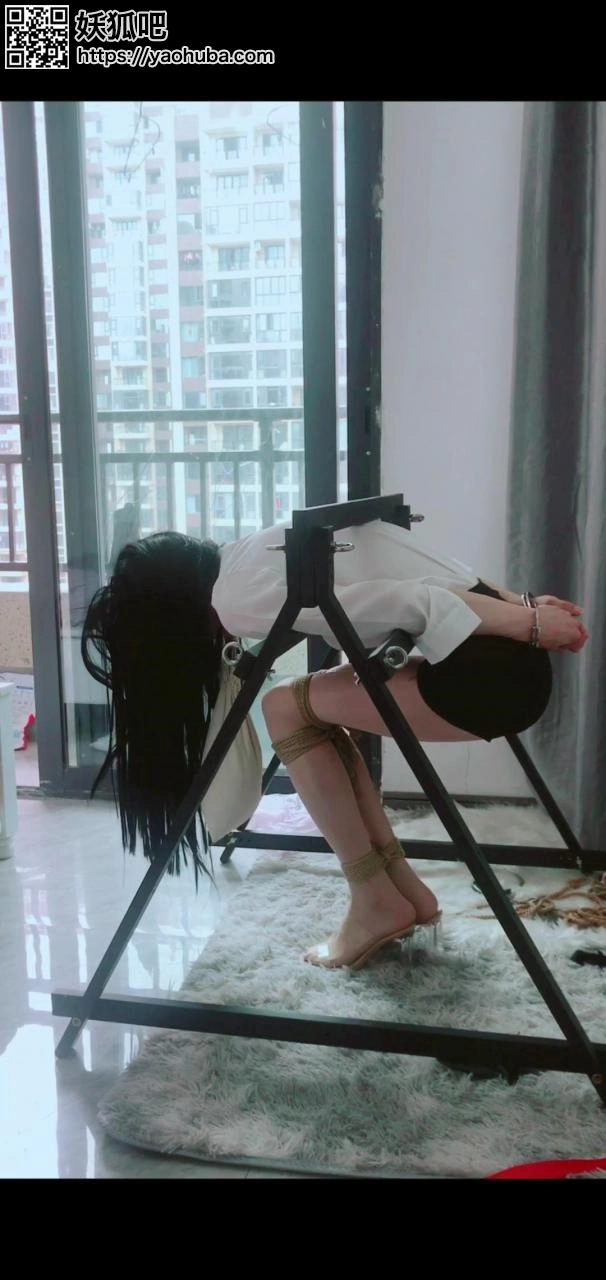 黑暗三角架又来了,这次换了一种非常难受的姿势,将身体用三角架的杆子固定起来,保持一种不能上不能下的姿势,这还不够,在在脖子间捆上一个沙袋,脖子时刻承受沙袋带来的重量,苦不堪言。自己的肚子与胸口紧贴固定起来的两根杆子,硬邦邦的梗得真的是非常难受。双腿被绳子并拢紧紧的捆在了一起,既不能伸直也不能蜷缩,可能是捆的太紧和这种姿势比较难受,导致双腿有些抽筋了,而脖子长时间吊着沙袋,我感觉我的脖子都快要断了,这种姿势的话一般用绳子捆起来都是比较难受的,貌似长时间保持这样的姿势都会比较难受,大家可以这样的姿势保持一段时间/偷笑????,绝对没有一点夸张。玩的时候全程大概是玩了两个小时左右,因为想要保持清晰度,站内发布的内存也有限制,所以就截取了二十多分钟。既然是三角架最后免不了骑在上面了,不过之前的拘束体力耗得差不多了,就简单玩了一下,不过还是比较难受,身体重量完全落在了一条腿上。