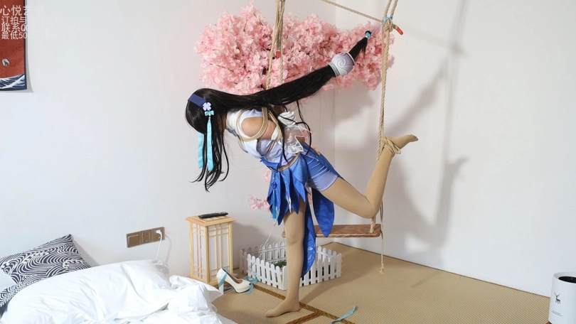 西施妹子被日式小高手紧缚,片足缚吊在秋千的粗绳上面。小脚丫动来动去的好可爱啊。