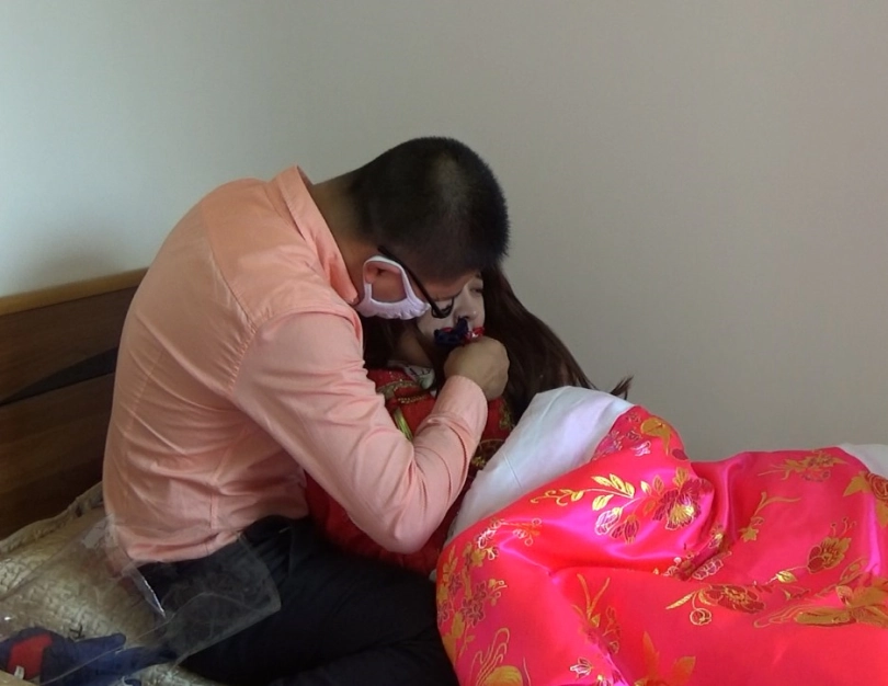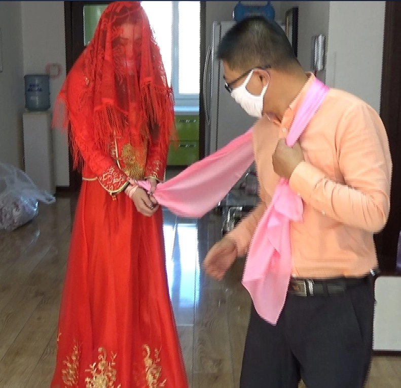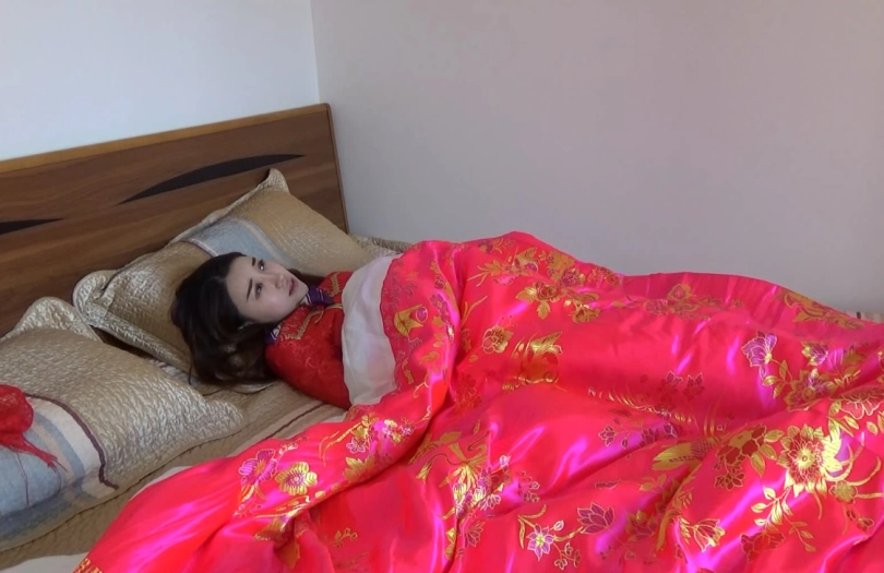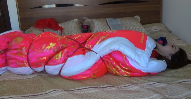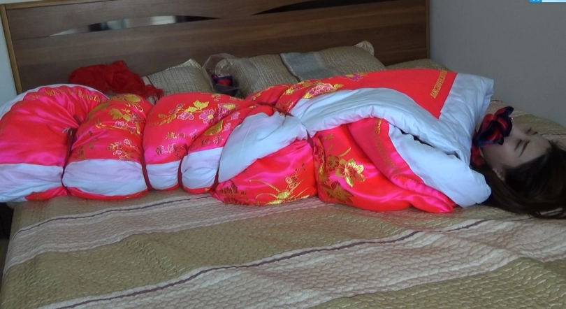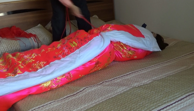 故事讲述了一个美丽女子总是幻想自己有一天可以嫁给一个白马王子,成为世界上最美的新娘,于是在家穿上美丽的新娘服,盖上盖头,红被子,独自幻想陶醉!她的一举一动却被邪恶的男邻居发现,有一天男邻居带着绳子来找她了.....片长23分钟,1080p全高清拍摄。丝巾堵嘴,棉被全包捆绑,手脚被缚,牵走入洞房.....