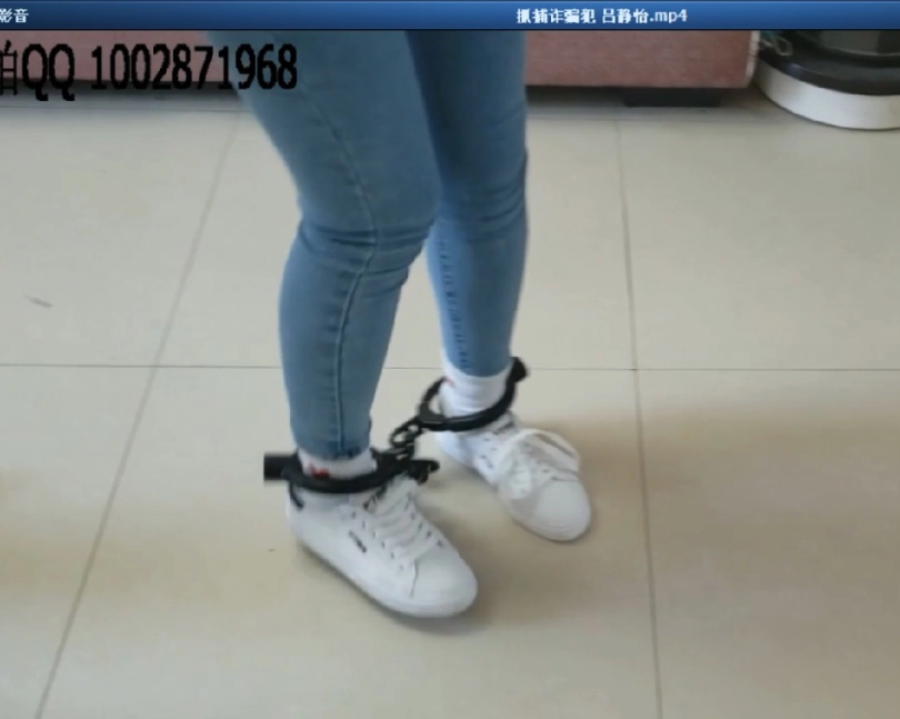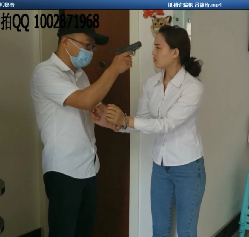 吕静怡光脚穿着拖鞋在家,打电话进行诈骗,诈骗完了之后,她自言自语说:今天又完成一单,可以去放松放松了,然后准备出门,突然有人敲门,这时候她只穿好了一只袜子,然后她就一只脚穿着袜子,一只脚光着去开门了。开门后,门外是警察,警察对她说,你因为诈骗被逮捕了,给她带上了手铐,准备带她走,这时候她问警察说:我能把那只袜子和鞋子穿上吗,警察说:可以。然后她穿上了袜子被带上脚镣跟警察走了。