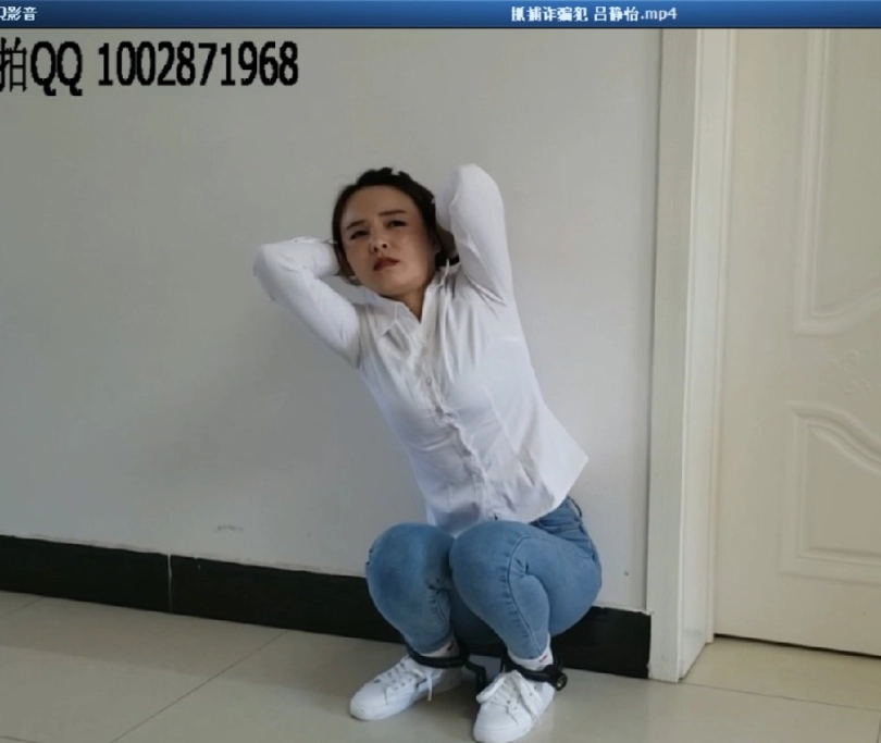 姓名:吕静怡,年龄:21,大二学生,因犯诈骗罪被逮捕,白色衬衫,蓝色牛仔裤,帆布鞋,白棉袜。