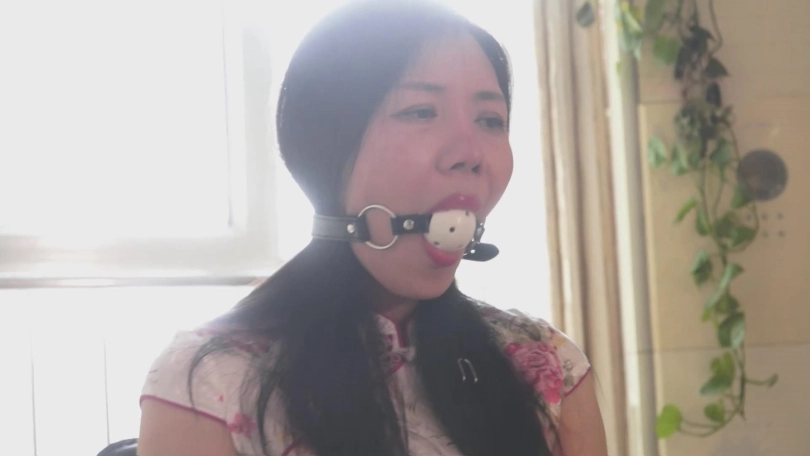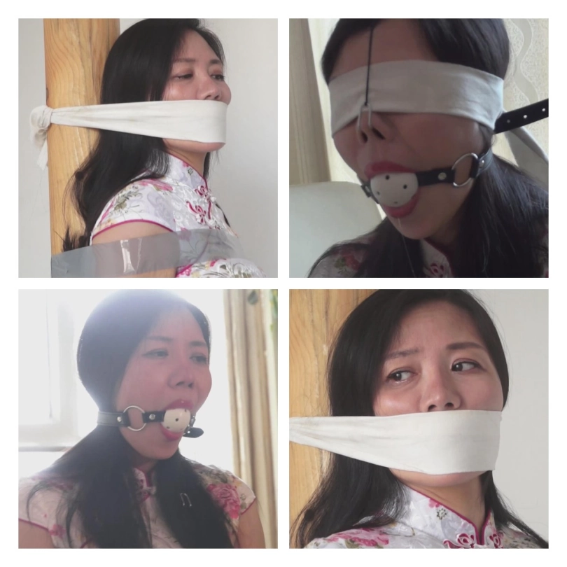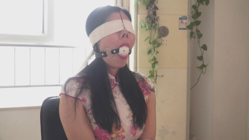 女井林静穿着肉丝袜和旗袍,被匪徒捆绑蒙眼,戴上口球,口水直流。腿上还绑有爆弹。之后又被绑在柱子上,白布蒙嘴。